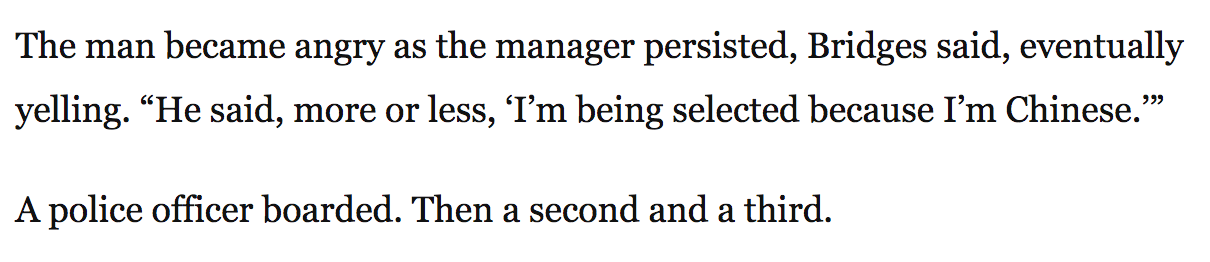 Sau đó, cơ trưởng buộc phải dùng máy tính chọn ngẫu nhiên hai người còn lại. Một người đã vui vẻ rời chuyến, hành khách châu Á còn lại được chọn đã nhất quyết không chịu rời khỏi ghế vì ông là một bác sĩ và cần về gấp để gặp bệnh nhân, vợ bác sĩ cũng đi cùng ông trong chuyến bay này.