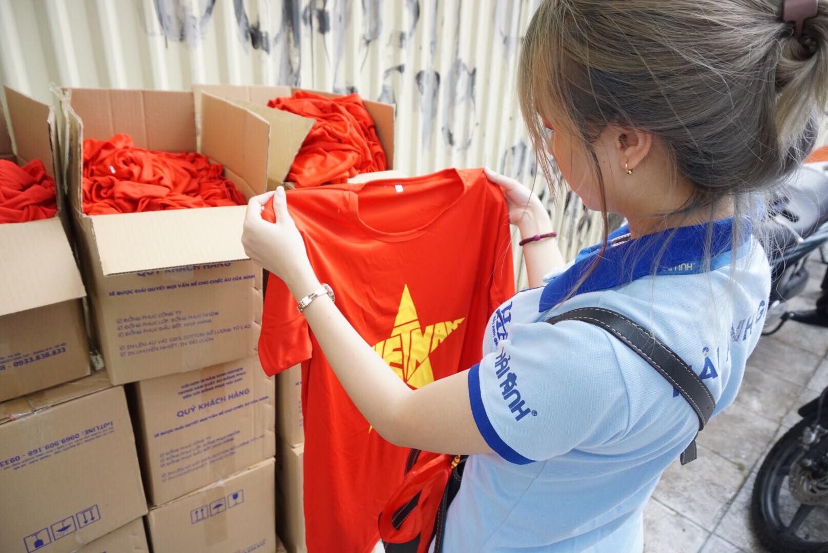 Các nhân viên công ty may đồng phục vui vẻ chuyển đến tay người dân chiếc áo và băng rôn cờ đỏ sao vàng để cổ vũ Olympic Việt Nam chiều nay.