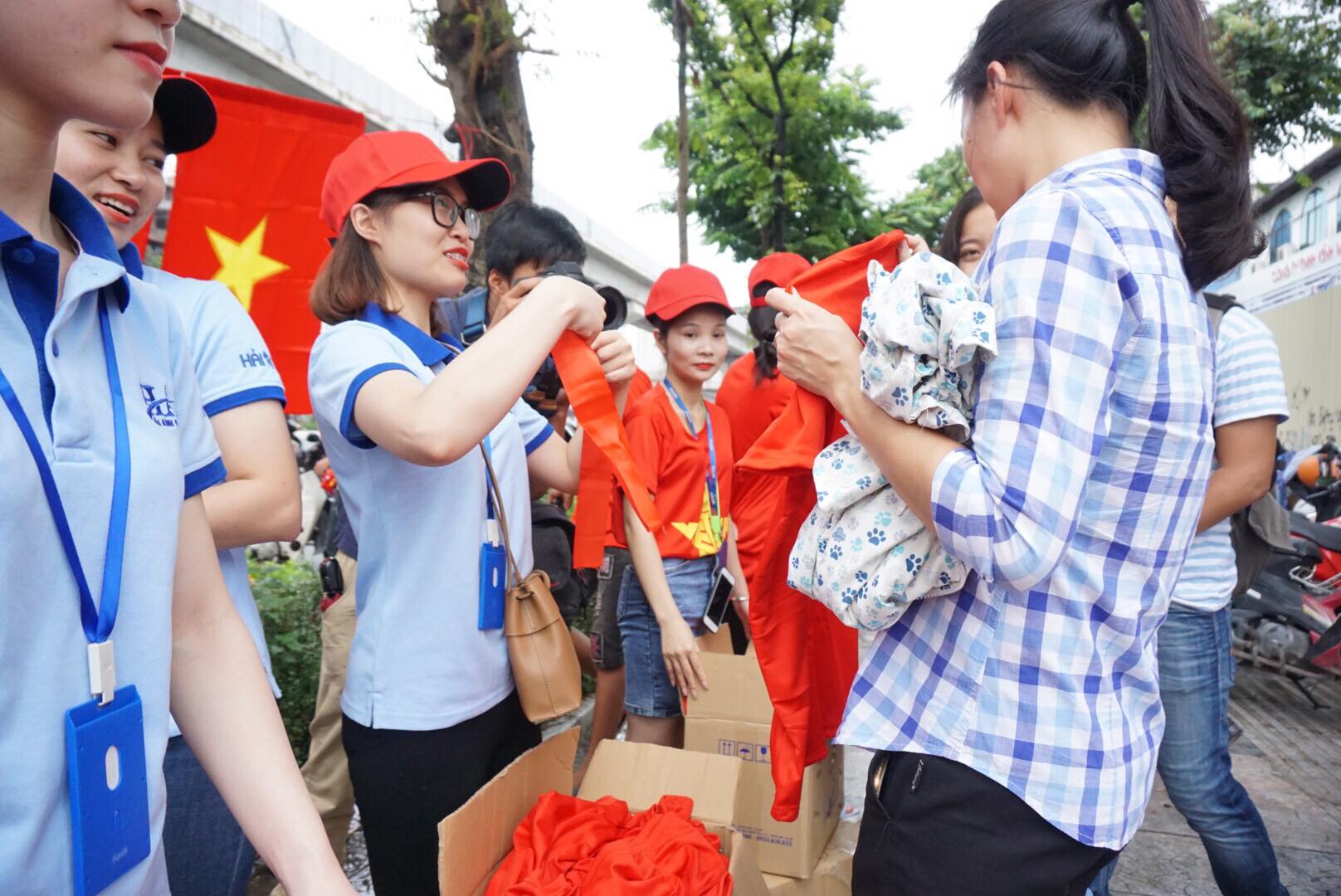 Đại diện công ty cho biết, ngoài việc tổ chức cổ vũ bóng đá cho gần 100 nhân viên tại hội trường, hơn 50 nhân viên đã được phân công phát miễn phí hơn 1000 áo phông cờ đỏ sao vàng cho người cổ vũ tại khu vực chân cầu vượt Ngã Tư Sở.
