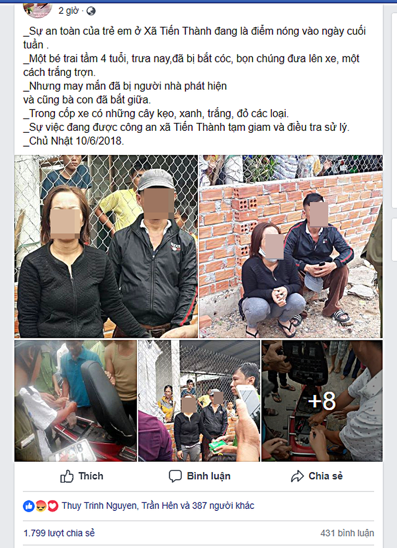 Trưa nay (10/6), một tài khoản trên mạng xã hội đưa thông tin kèm hình ảnh cho rằng vừa bắt quả tang một vụ bắt trẻ em tại xã Tiến Thành, TP Phan Thiết (Bình Thuận) thu hút sự chú ý của cộng đồng mạng.