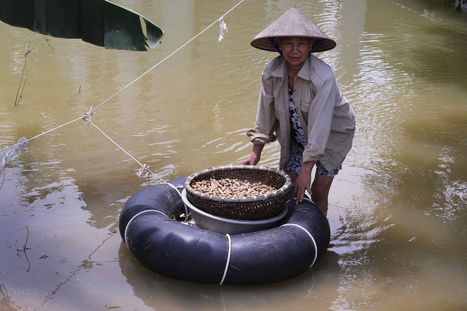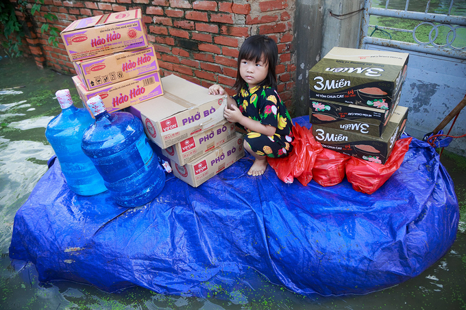 Ở những nơi nước vẫn ngập sâu quá mắt cá nhân, người dân dùng các phương tiện tự chế để đi lại, nhận đồ cứu trợ.