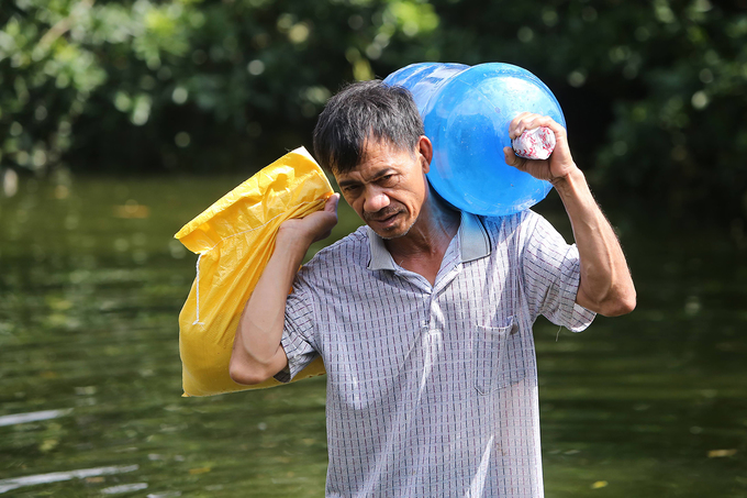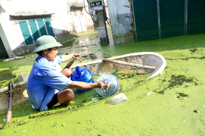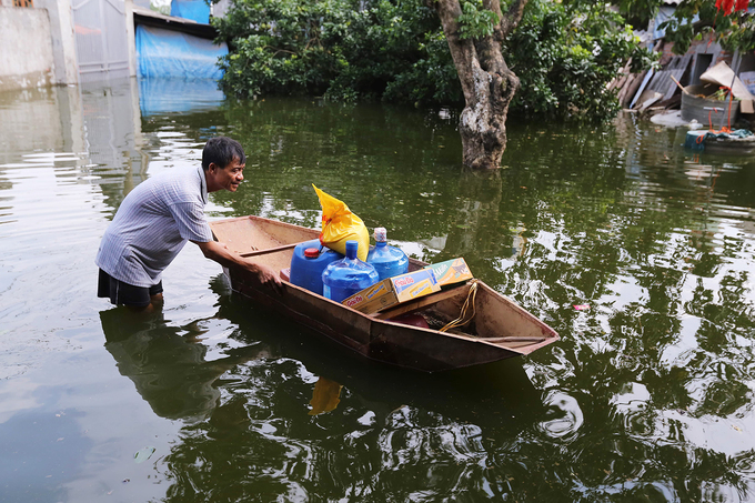 Ông Duẩn (xã Nam Phương Tiến) bơi thuyền khoảng một km từ nhà đến thôn Nhân Lý để lấy nước sạch. Trên đường về, chiếc thuyền nhỏ chòng chành và bị đắm. Ảnh: Gia Chính