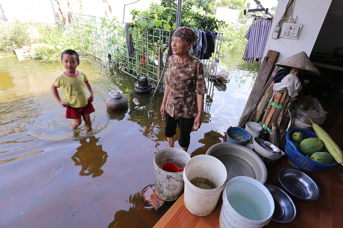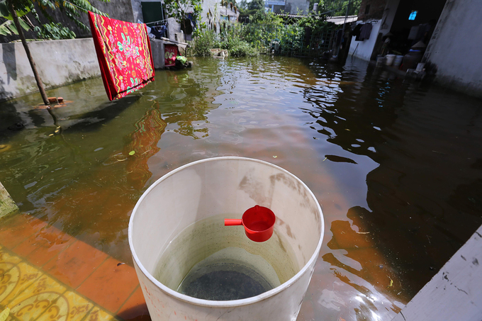 Gia đình bà Hậu dùng tất cả các loại xô, chậu trong nhà để hứng nước mưa, sử dụng cẩn thận từng gáo nước để tránh lãng phí. “Nước đã bắt đầu rút nhưng nhà tôi không có nước để lau rửa nền và đồ dùng trong nhà, trong nhà lúc nào cũng có mùi hôi tanh khó chịu”, bà nói.