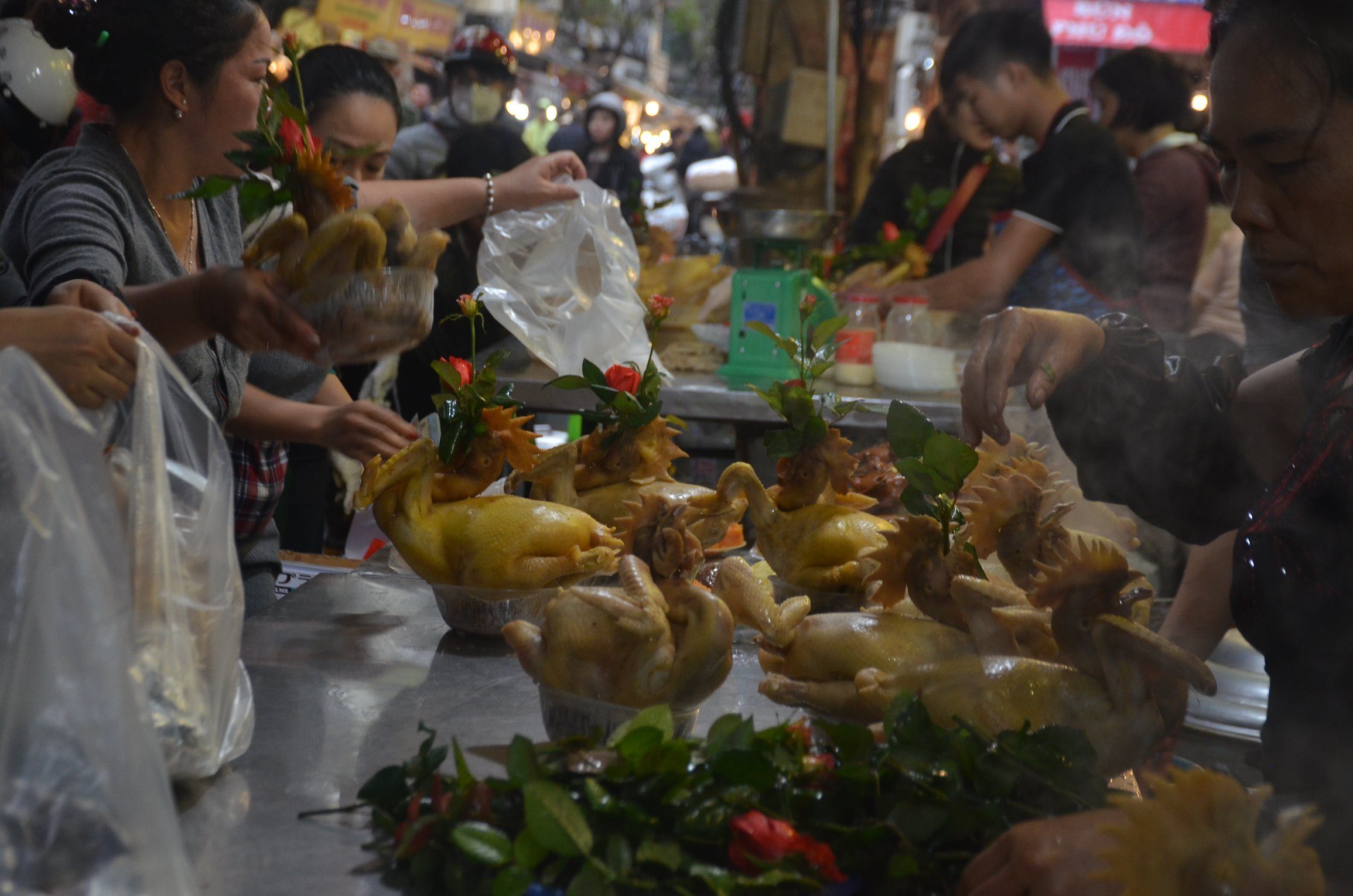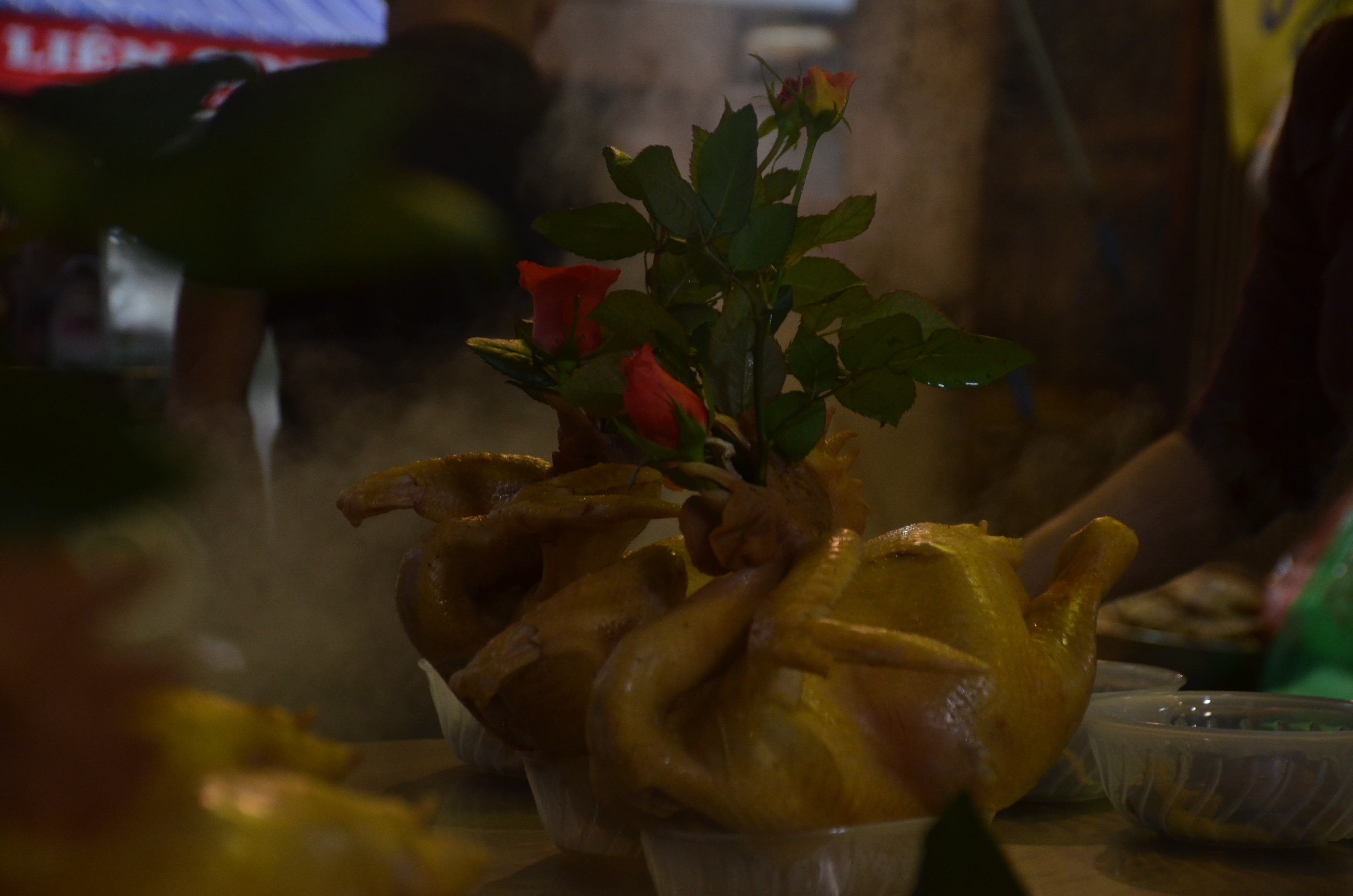 Chính vì vậy từ sáng sớm chị Thuỳ đã chuẩn bị nhiều đồ lễ, riêng gà luộc với xôi sát giờ cúng chị mới ra mua. Cũng theo ghi nhận, giá mỗi con gà luộc tại đây từ 250.000 - 400.000 đồng/con tùy trọng lượng.