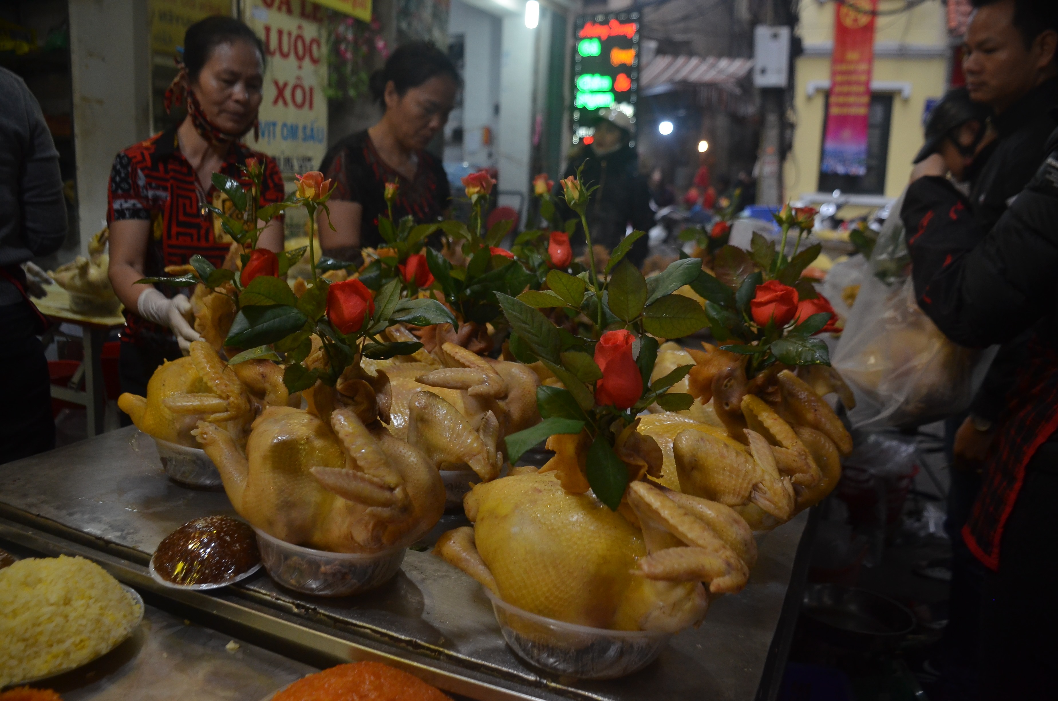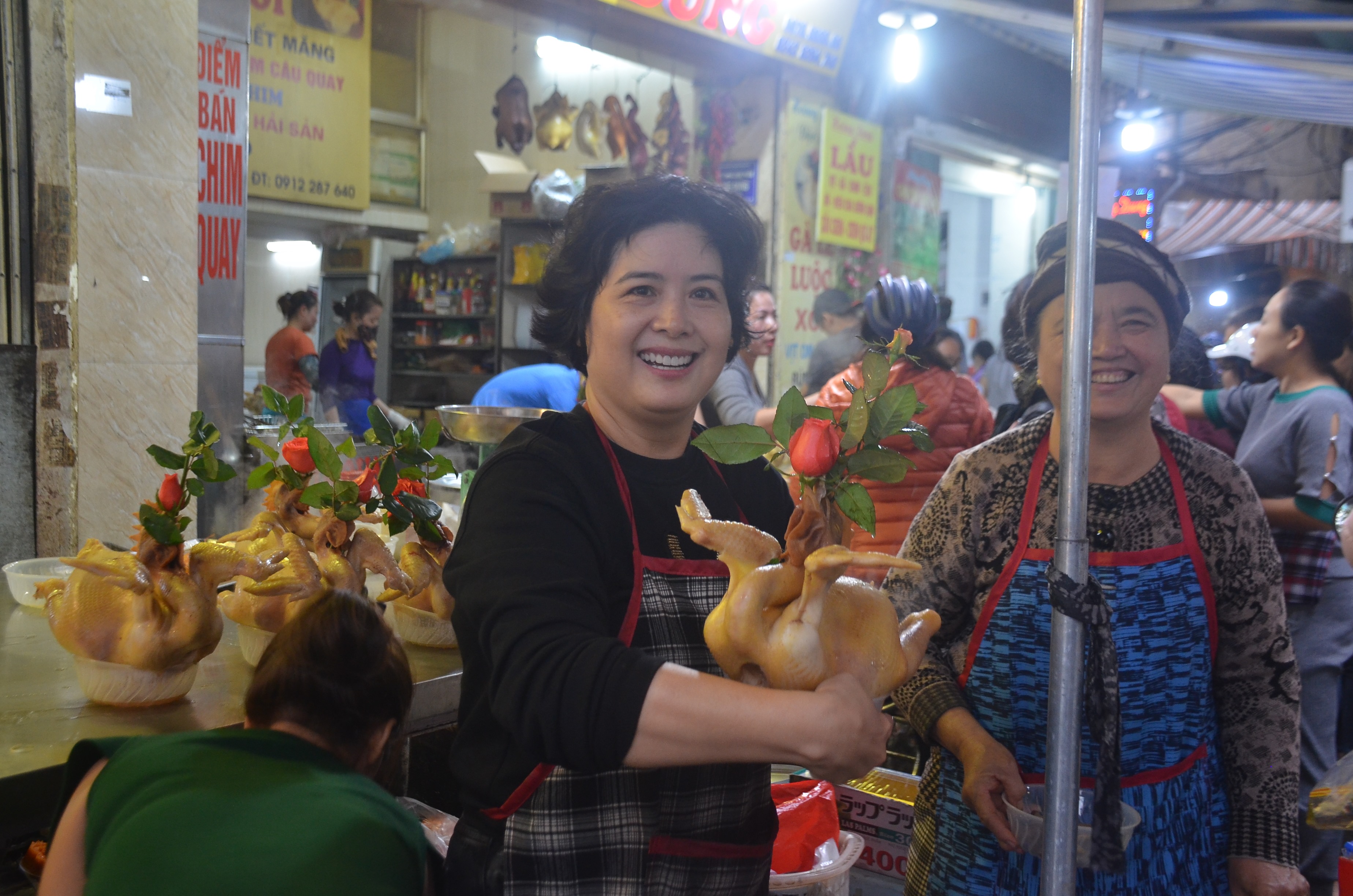 Tại chợ Hàng Bè, phố Gia Ngư có 2-3 cửa hàng bán gà luộc, xôi gấc, giò chả đã trở nên quá tải khi lượng khách kéo đến đông đúc. Chủ cùng nhân viên hoạt động liên tây lấy đồ lễ cho khách. Chị Bích Thùy trú tại phố Cầu Gỗ cho biết, gia đình chị sẽ tiến hành cúng ông Công ông Táo trước 12h trưa.