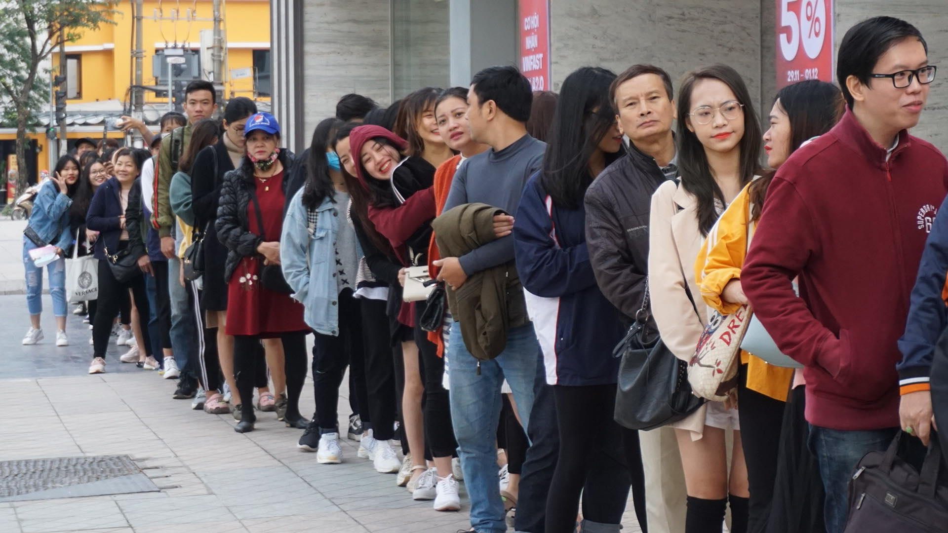 Người dân Hà Nội xếp hàng trước cửa trung tâm thương mại.