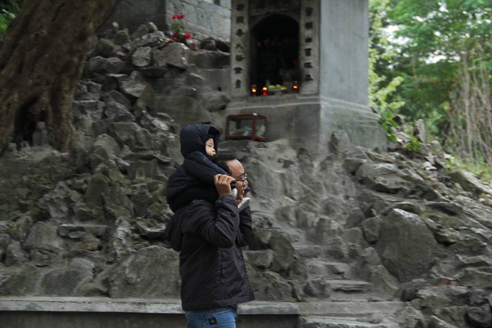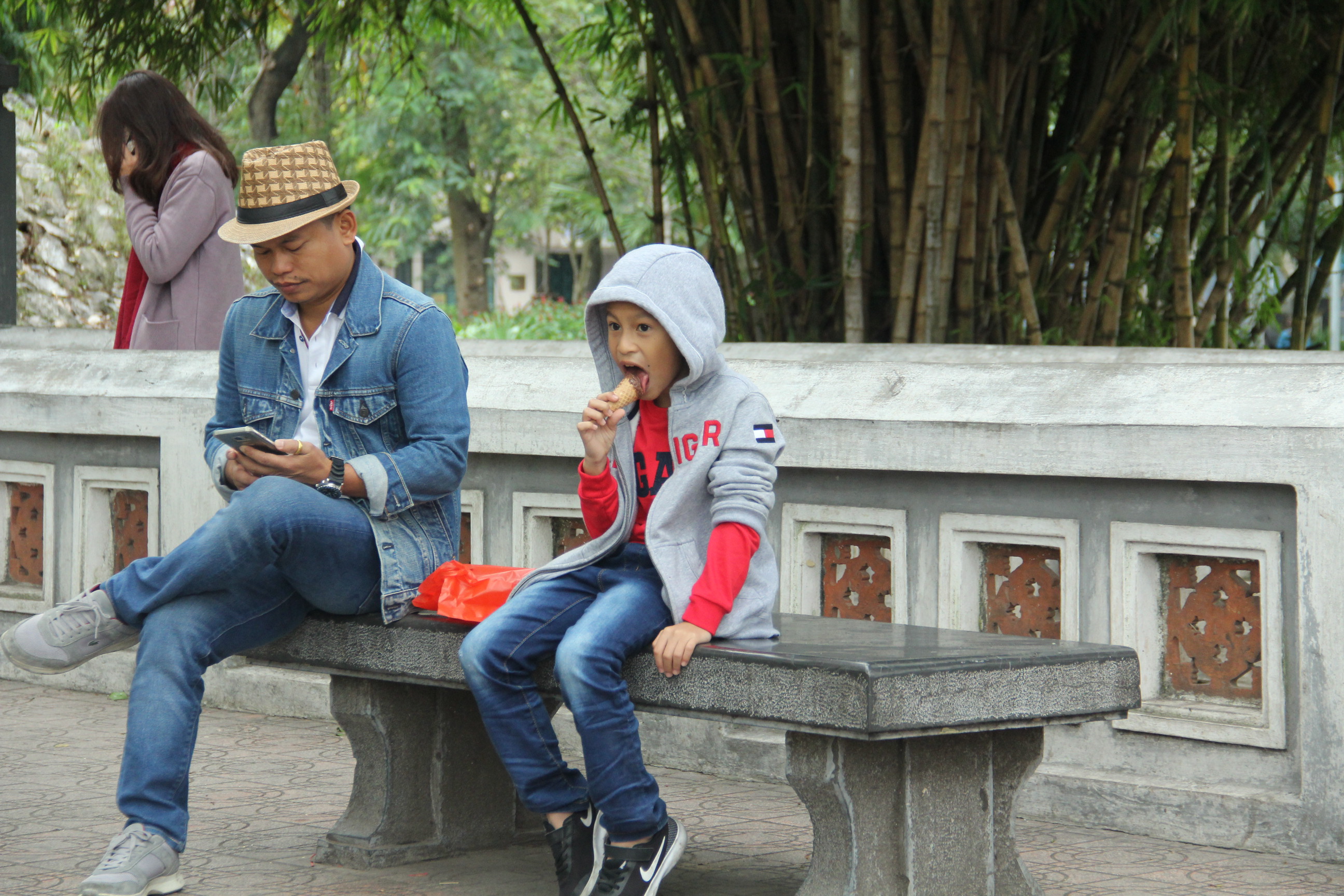 Hai bố con tránh lạnh bằng chiếc áo khoác