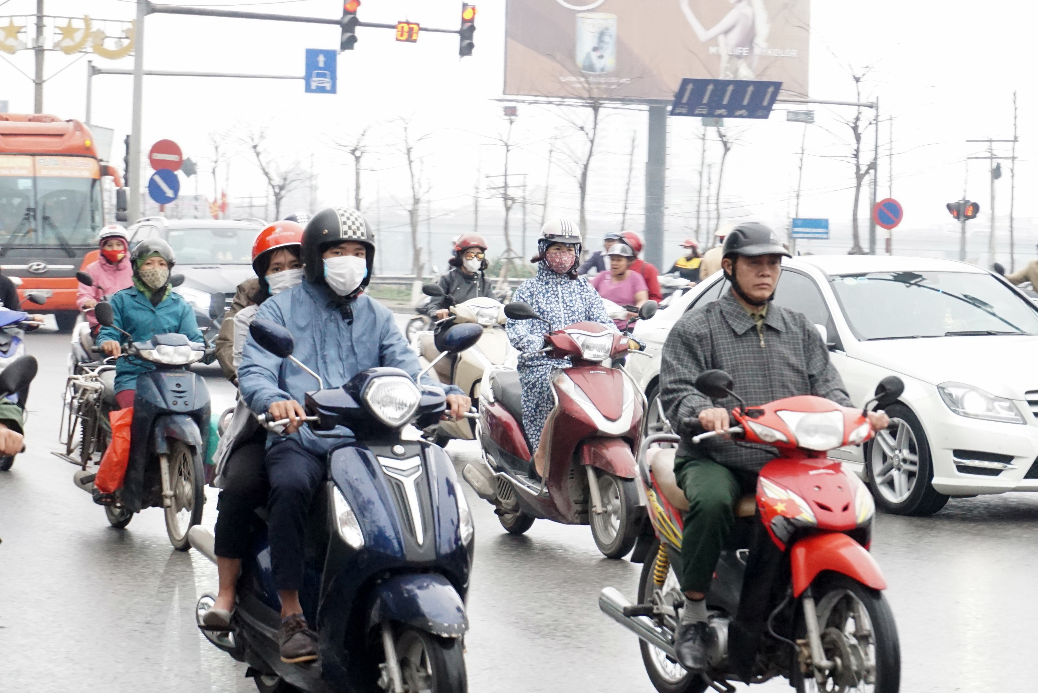 Nhiều người mặc áo mưa tránh gió rét ngày đầu năm. Hôm nay nền nhiệt cũng giảm, xua tan đi cái nắng nóng những ngày Tết.