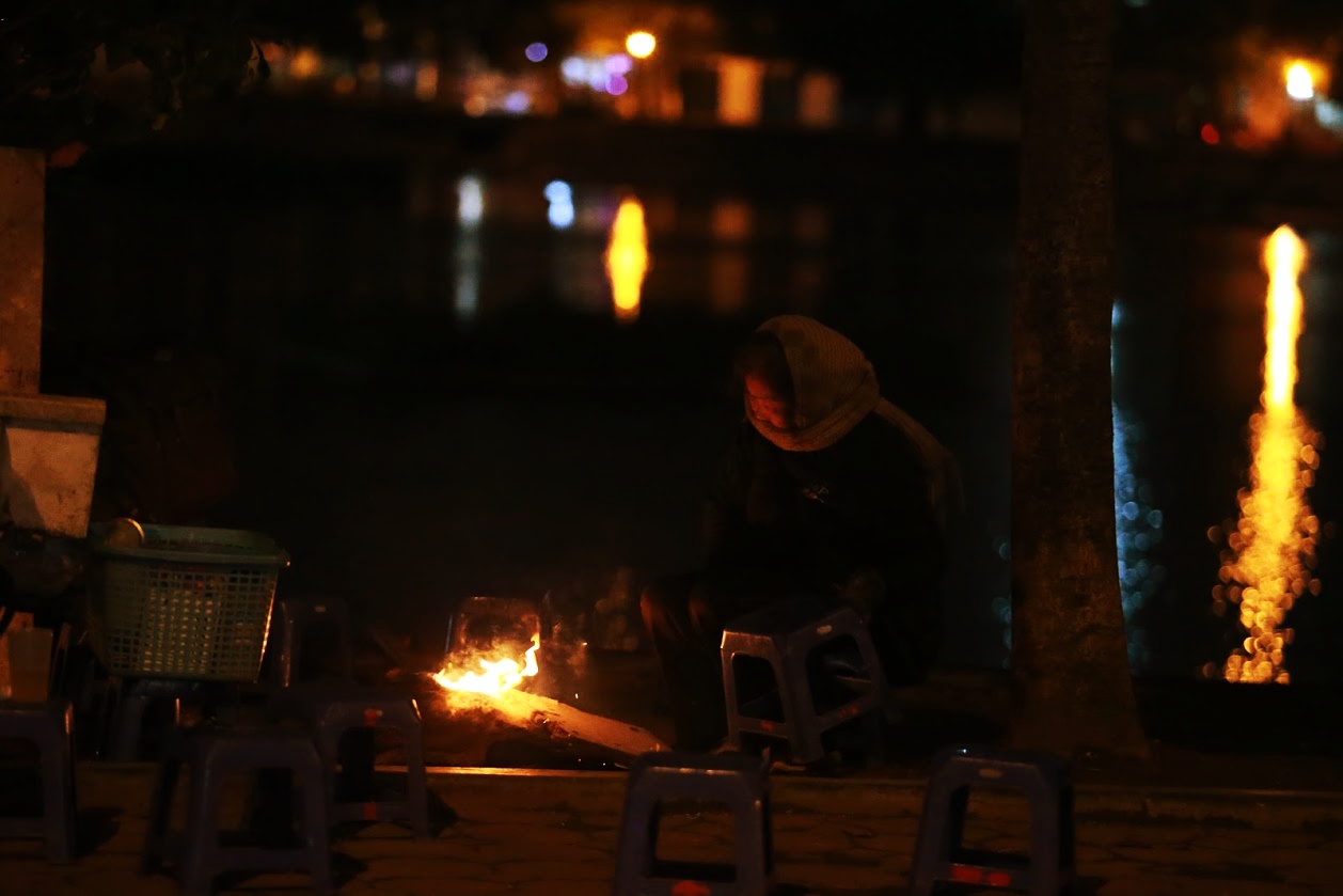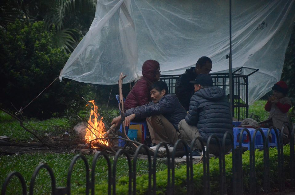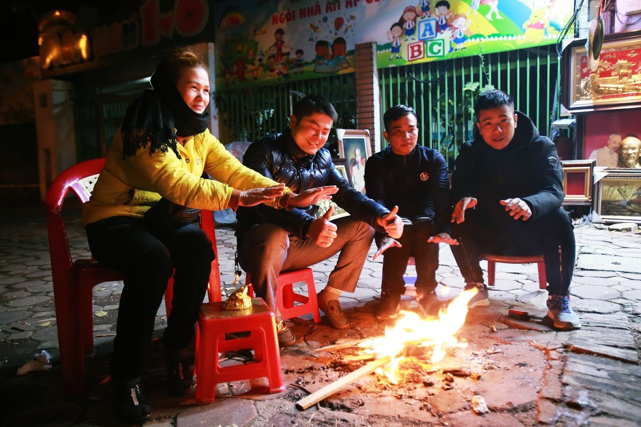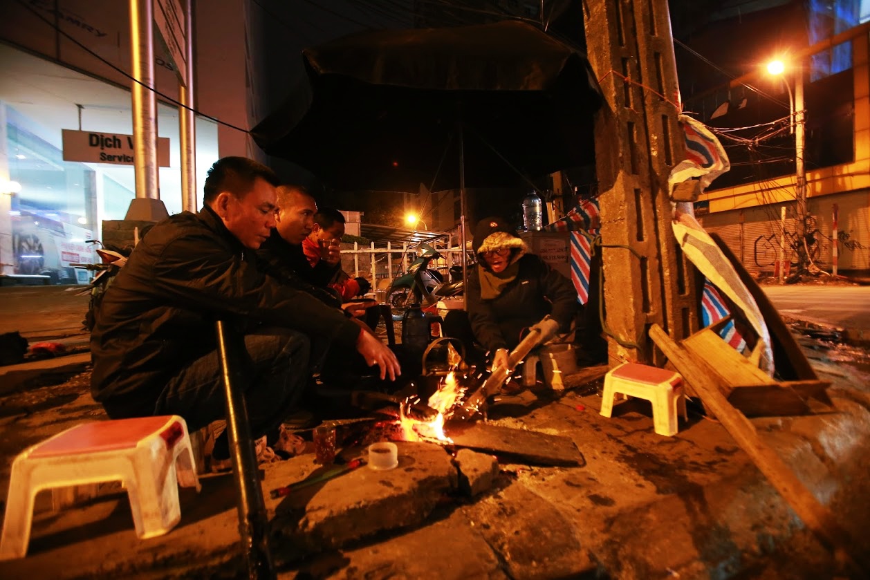 Một nhóm những người lao động tự do đốt lửa sưởi ấm trên đường Láng.
