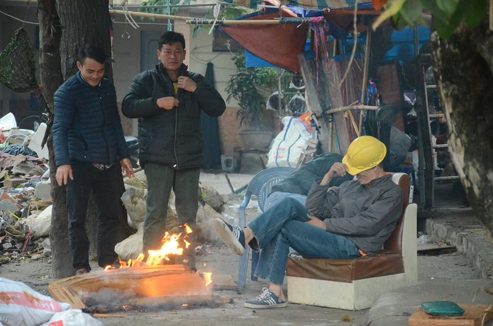 Nhóm công nhân đốt lửa sưởi ấm vào ban ngày ở khu vực chợ Ngã Tư Sở.