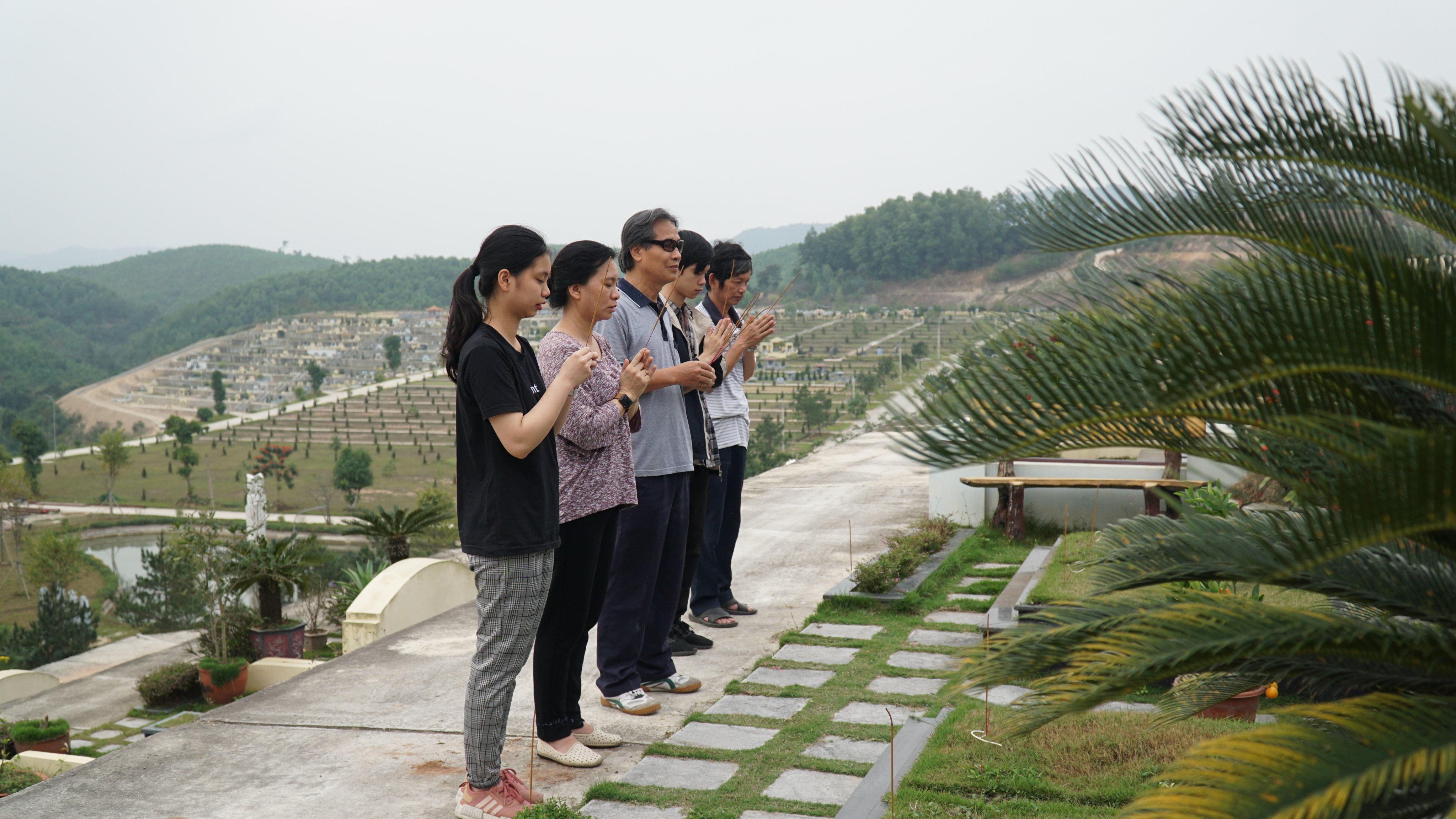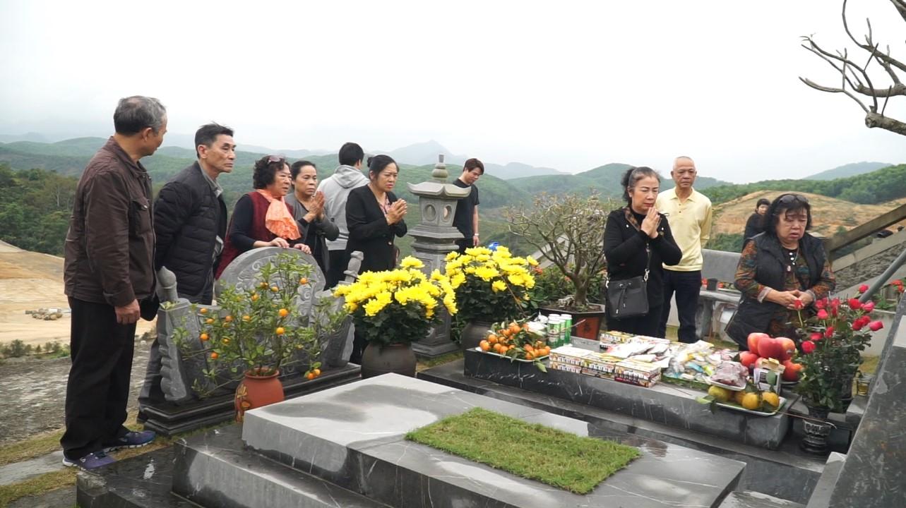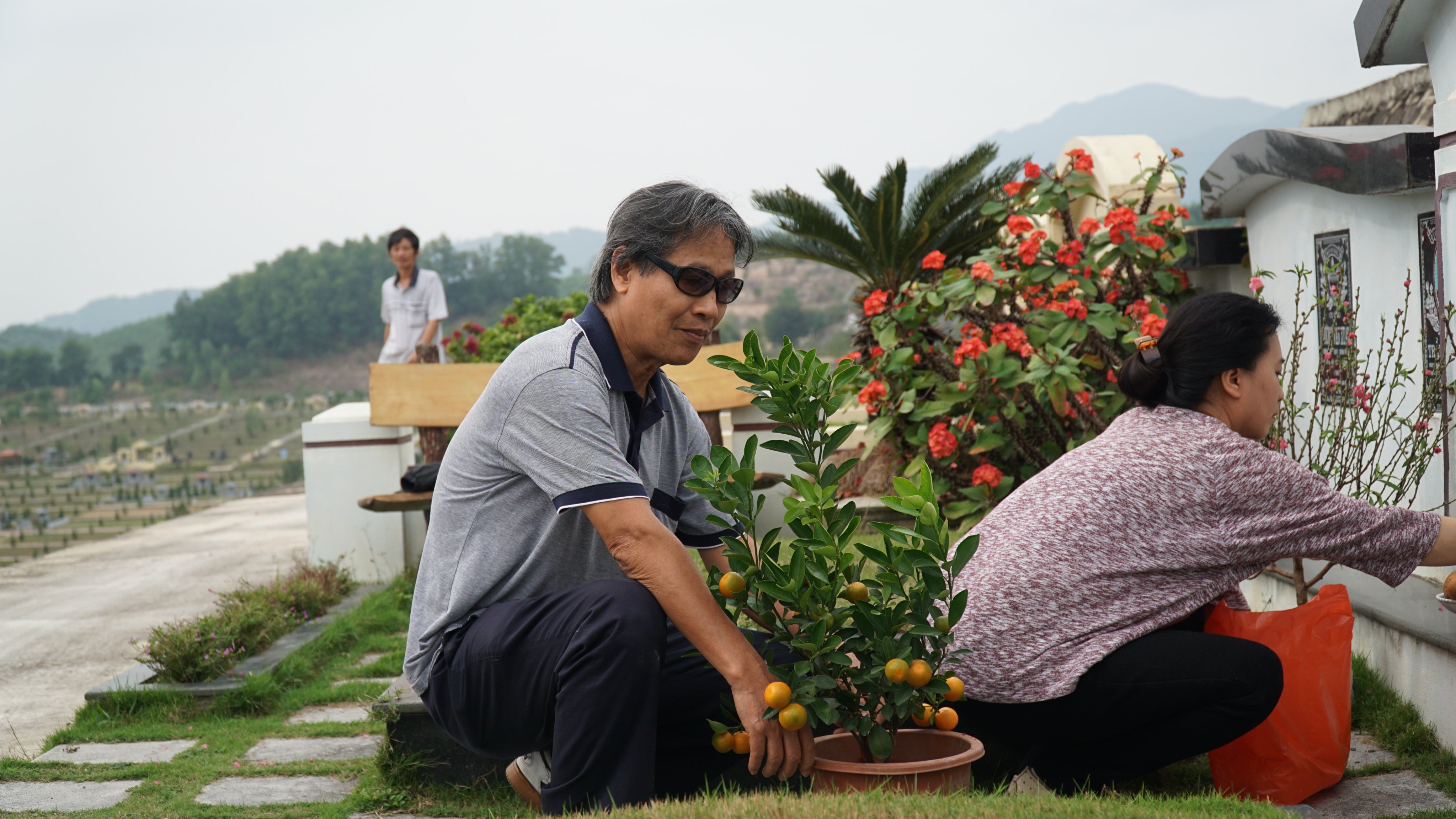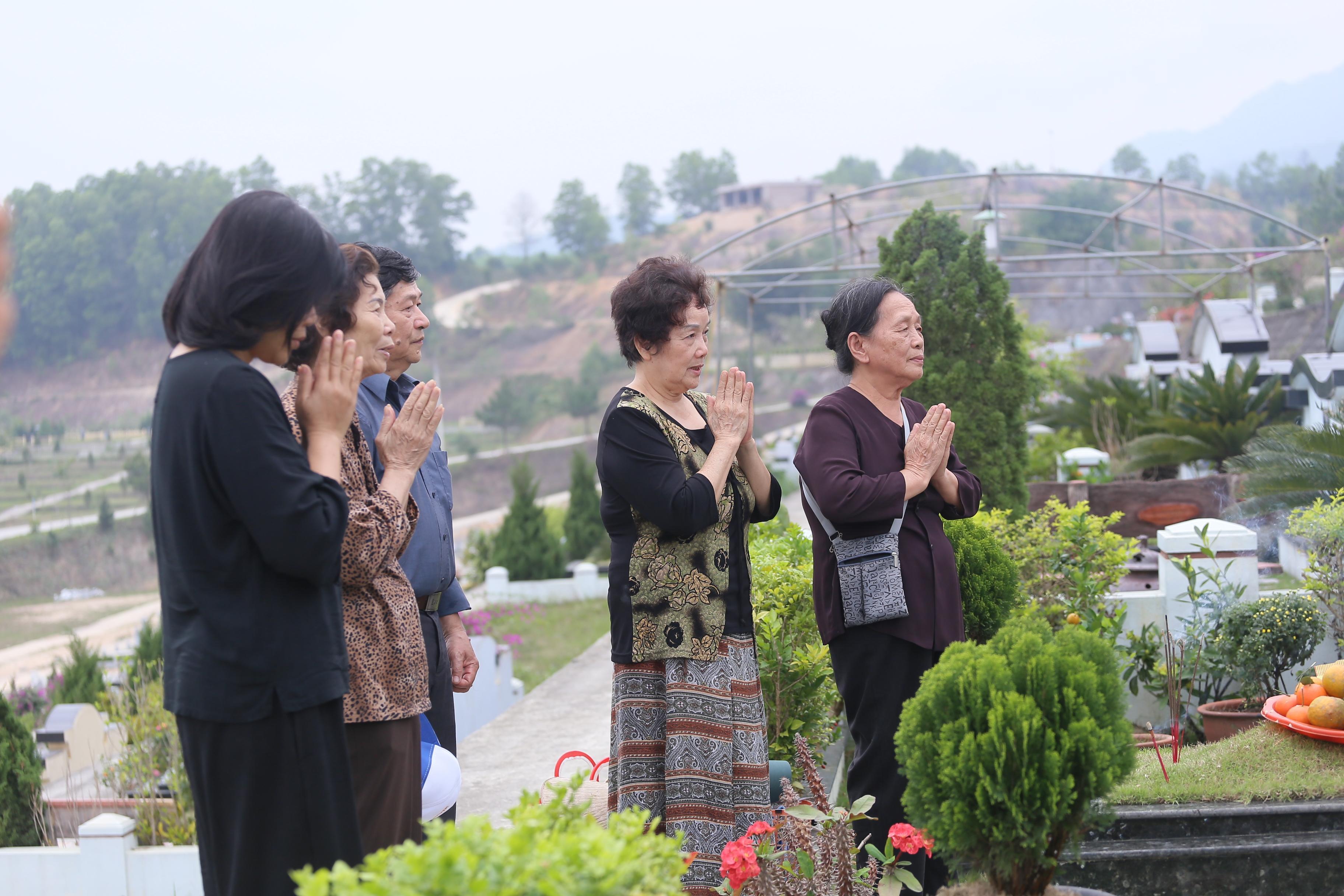 Bà Trần Thị Nhung (70 tuổi, ở Hà Nội - thứ 2 từ phải sang) cho biết, bà cùng bốn chị em trong gia đình hàng năm đều sắp xếp thời gian sau rằm tháng chạp lên thăm mẹ được an táng tại Hòa Bình. Bà Nhung chia sẻ, cụ thân sinh ra bà đã an nghỉ tại công viên nghĩa trang Lạc Hồng Viên được 5 năm. Hàng năm, vào các dịp Tết Thanh minh, Tảo mộ, lễ Vu Lan báo hiếu… gia đình anh chị em dâu rể đều tổ chức cùng con cháu lên thăm cụ.