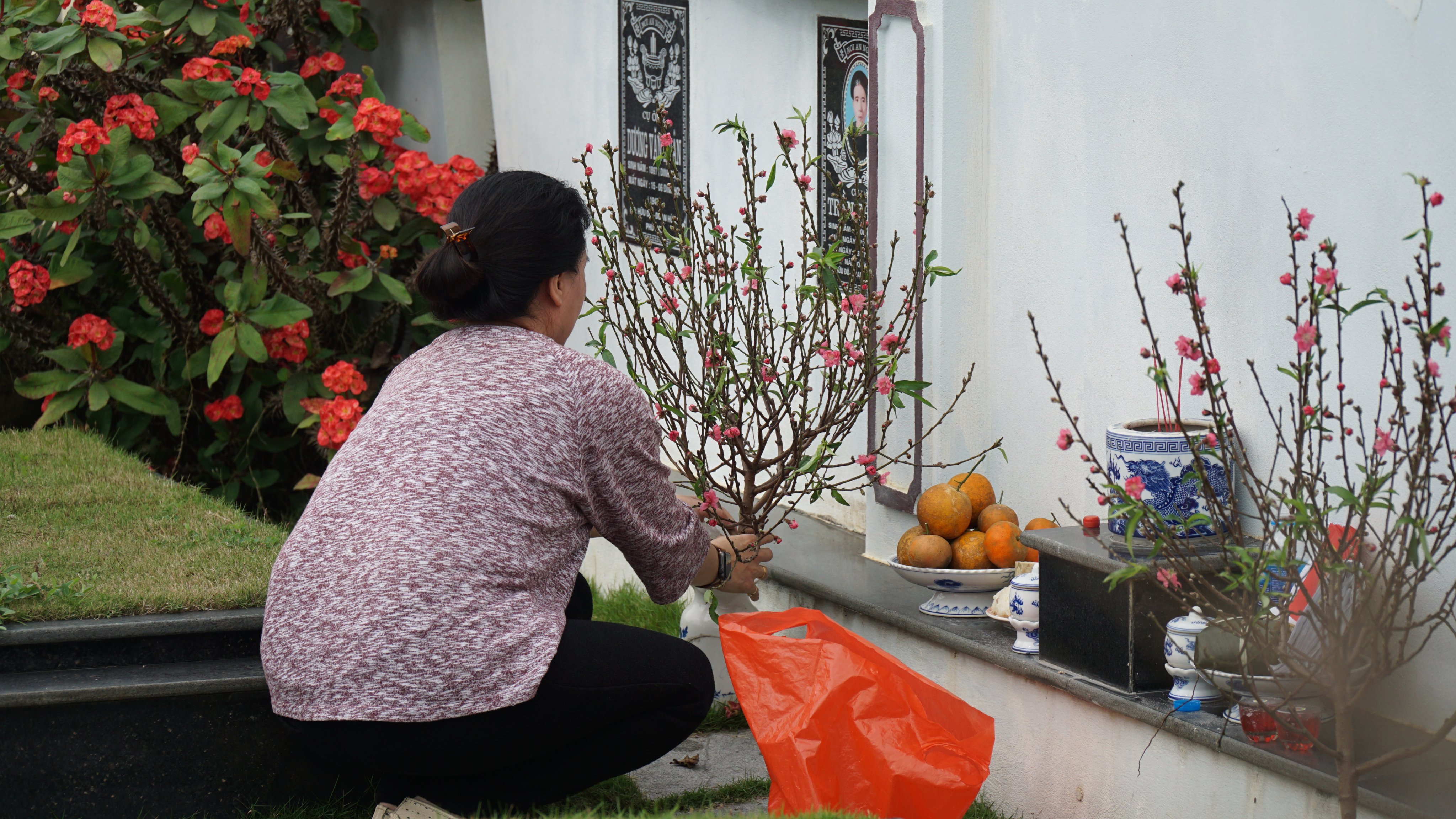 Mọi người dọn cỏ quanh mộ phần và chuẩn bị hoa quả, mâm cơm cúng tổ tiên, ông bà.