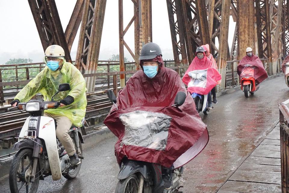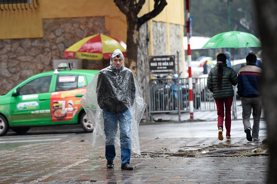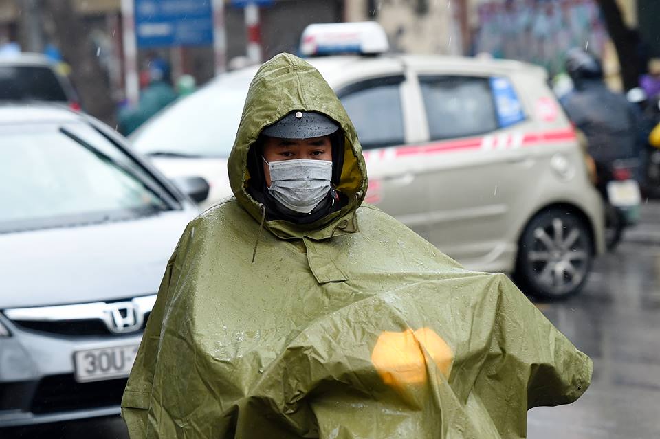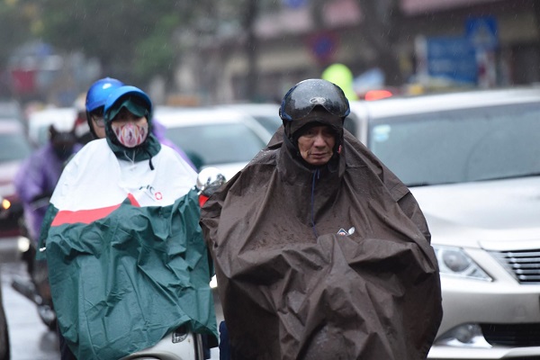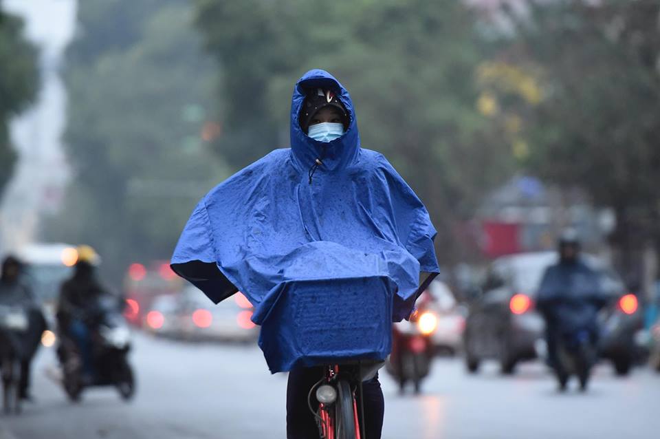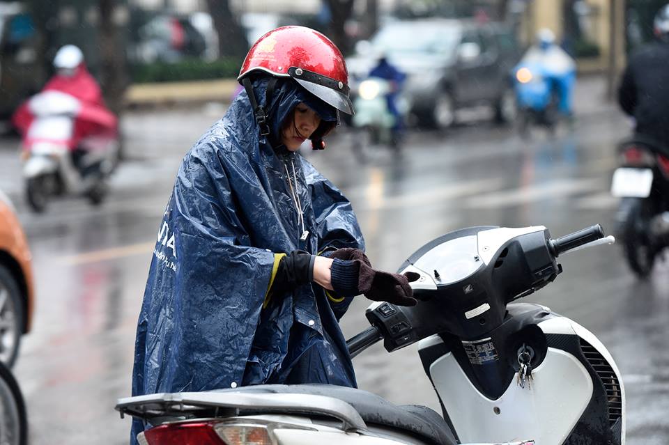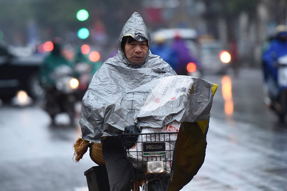 Theo ghi nhận của nhóm PV, ngay từ sáng sớm, nhiều người dân tại Hà Nội đã phải mặc áo khoác dày và áo mưa ra đường để tránh gió lạnh.