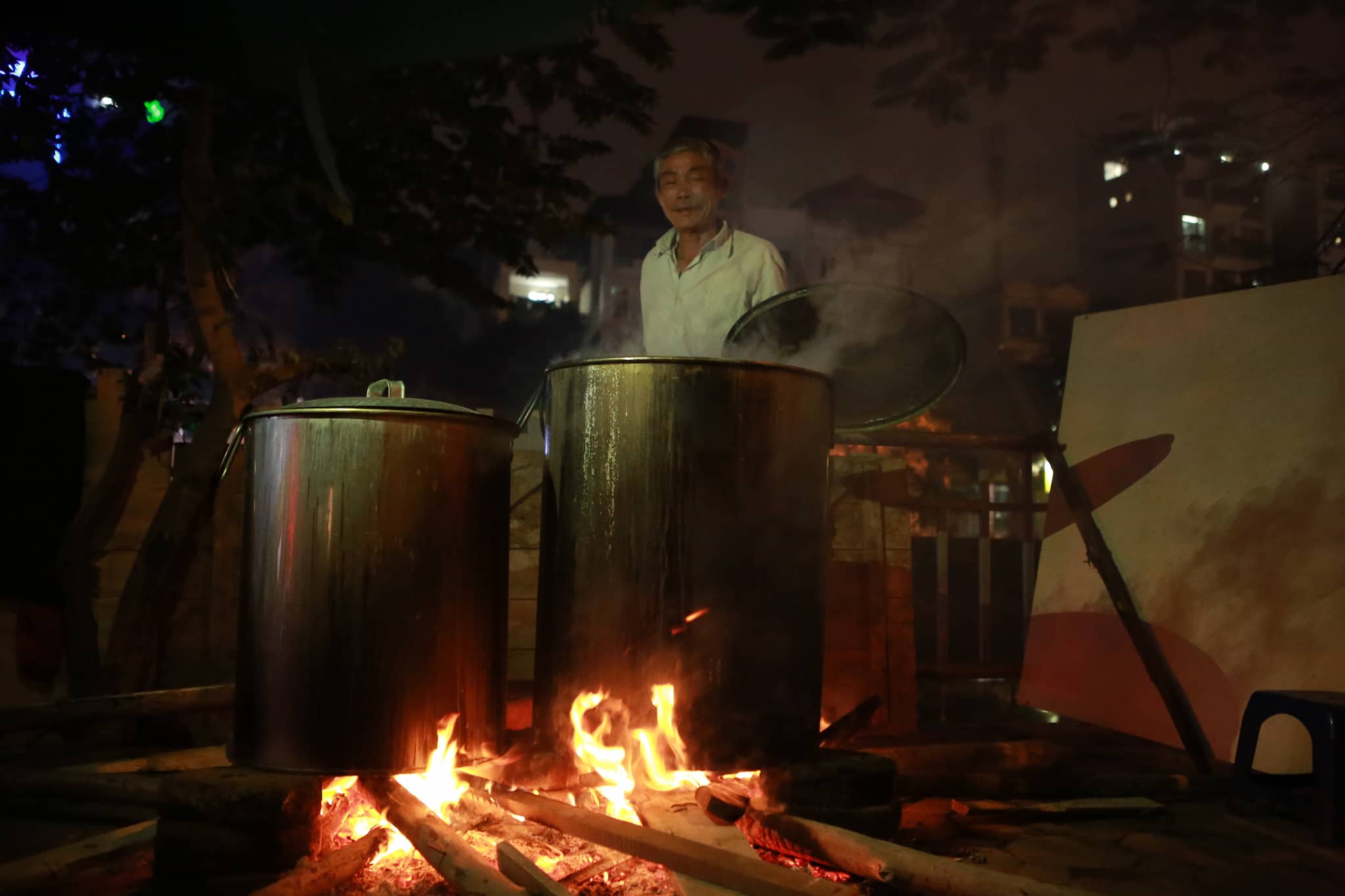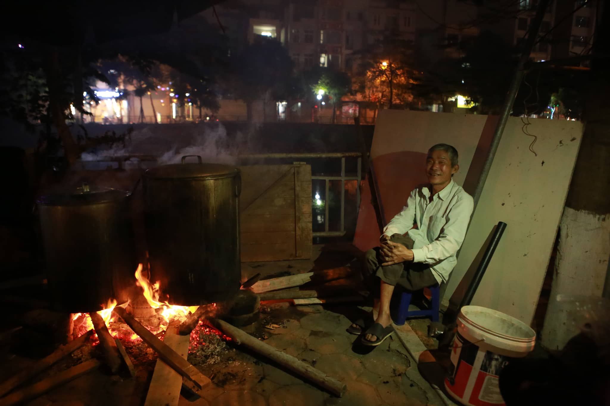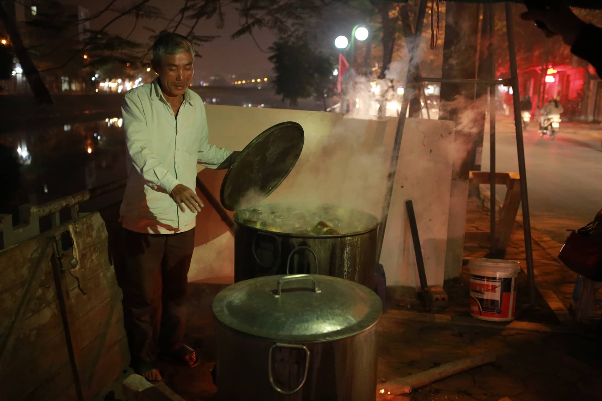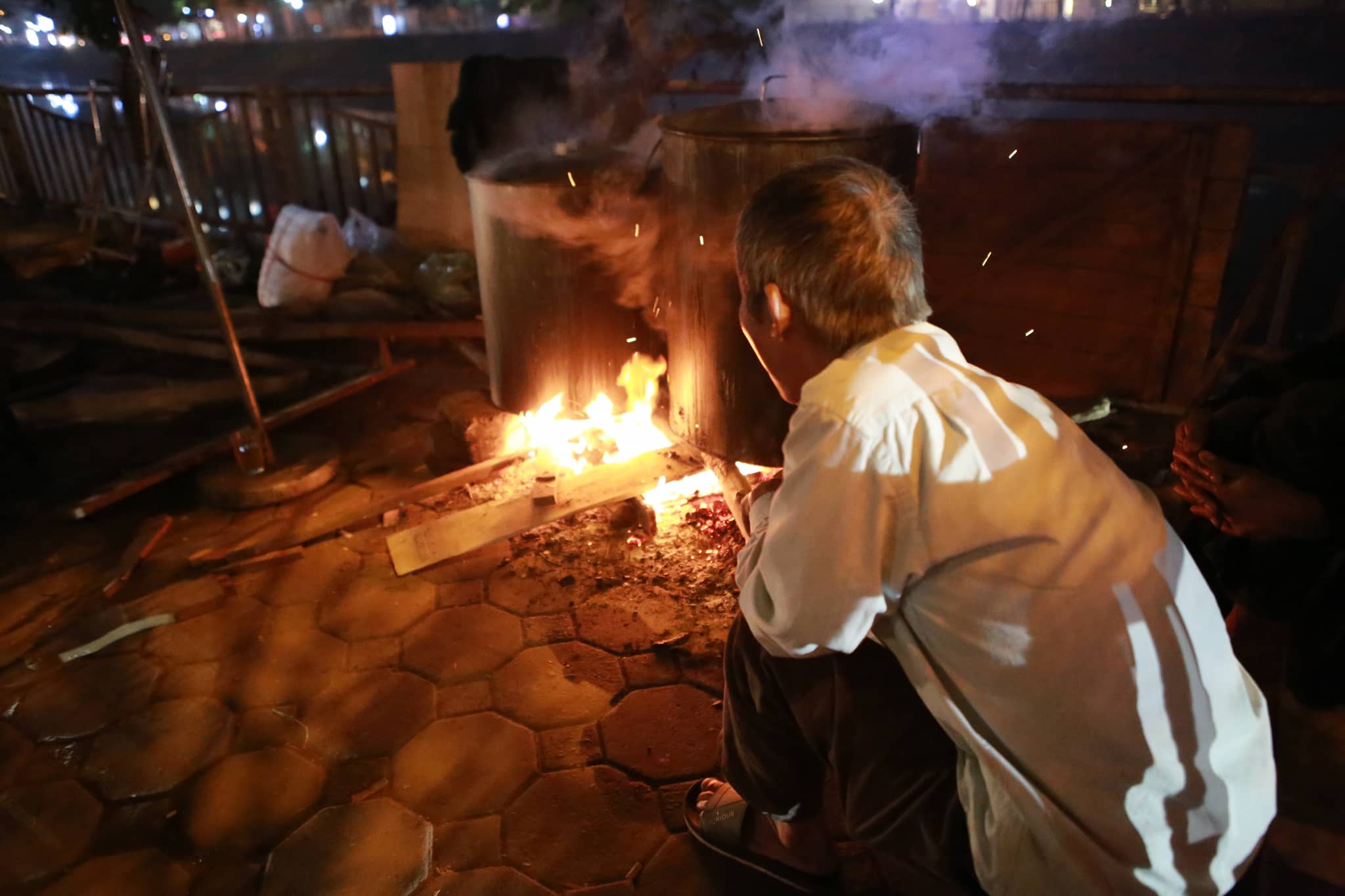 Phải đến tối khi mọi người đã đi ngủ, ông Sơn mới ra bắc bếp trên vỉa hè dọc sông Tô Lịch cùng với một chiếc điếu cày bầu bạn suốt đêm.