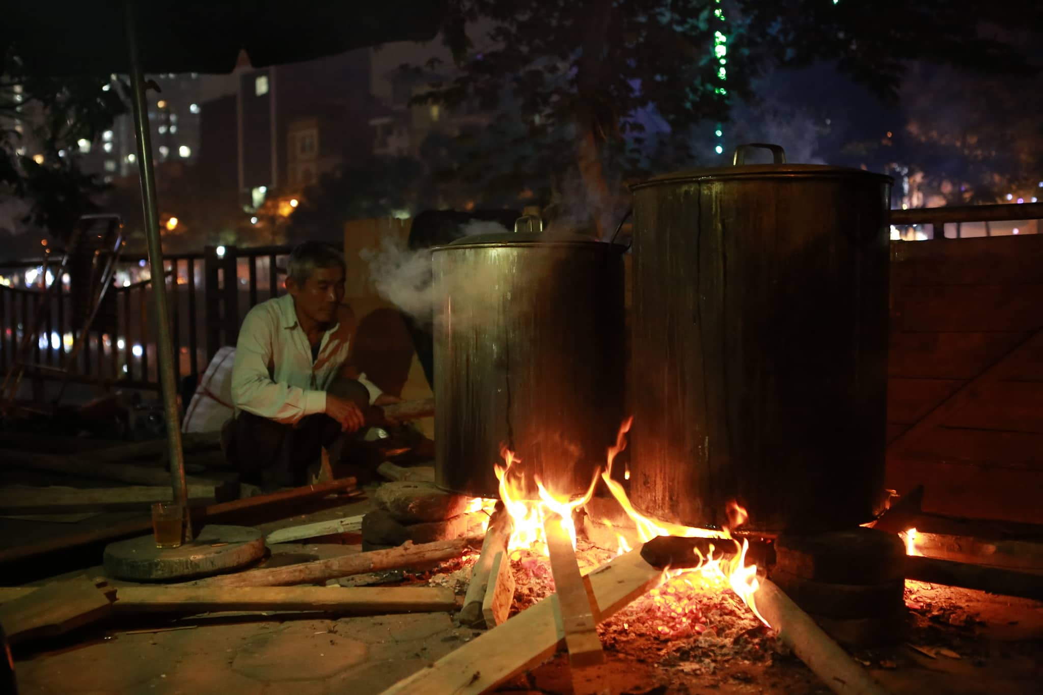 Ông Sơn cho hay, bánh chưng phải luộc kéo dài suốt 12 tiếng đun bằng củi đến sáng sớm mới có thể vớt ra, coi như thức trắng đêm để canh nồi bánh chưng.