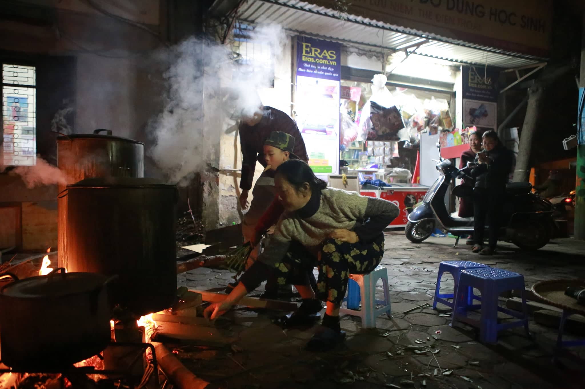 Gia đình bà Đỗ Thu Thuỷ (60 tuổi, ở Khương Hạ, Thanh Xuân, Hà Nội) gồm 4 thế hệ sinh sống đang quây quần cùng các cháu nhỏ bên nồi bánh chưng đỏ rực.