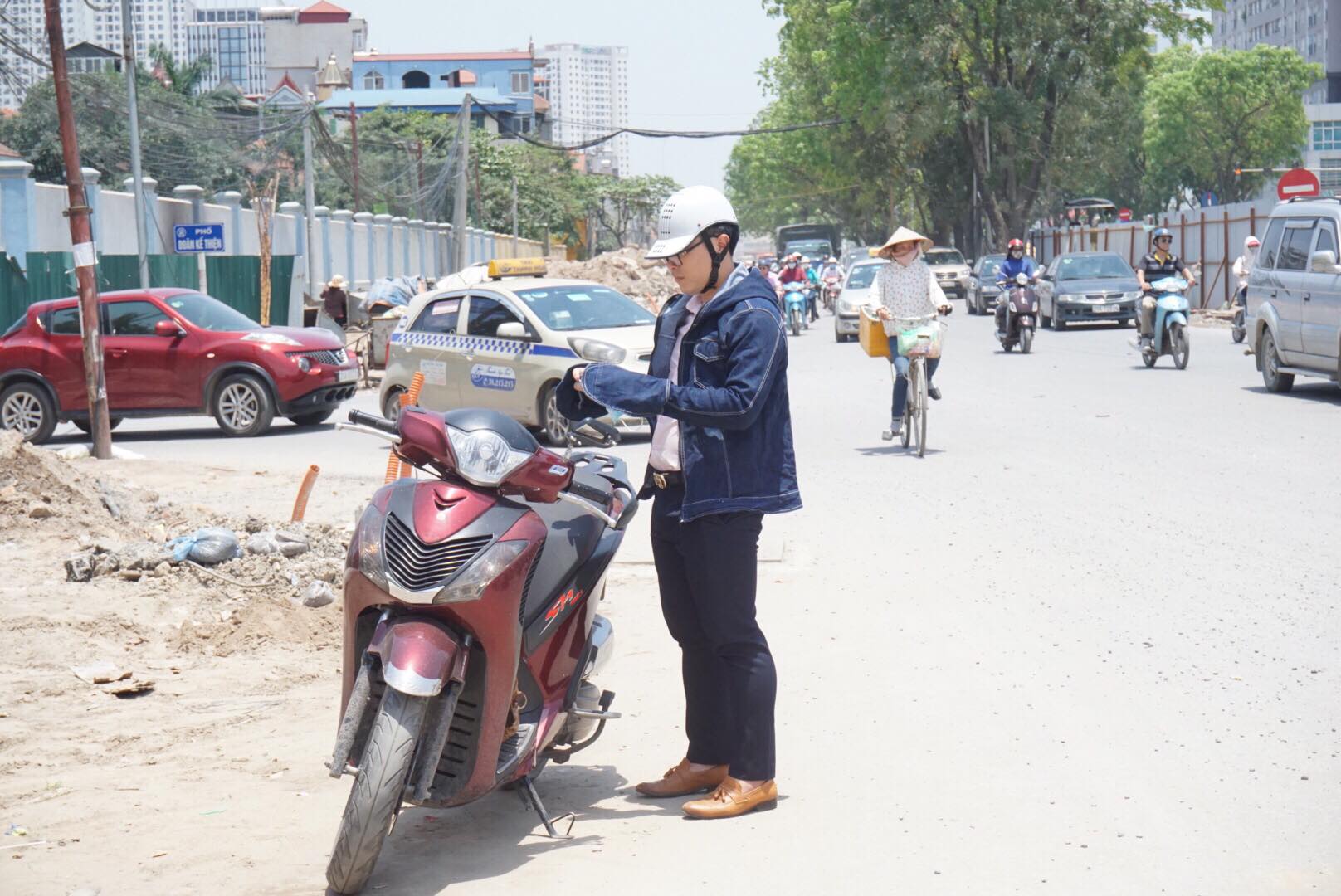 Một nam thanh niên phải dừng xe bên lề đường khoác áo để bớt nắng rát.
