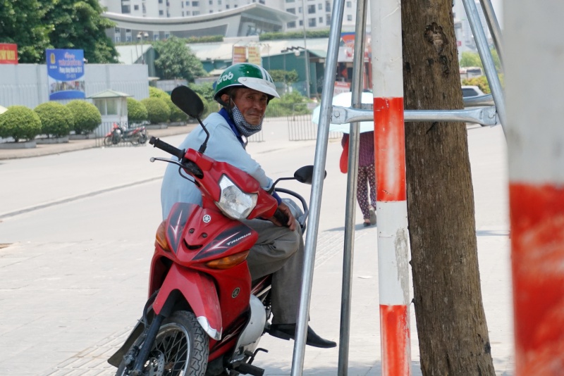 Một tài xế xe ôm mệt mỏi ngồi chờ khách bên gốc cây ven đường Phạm Văn Đồng.