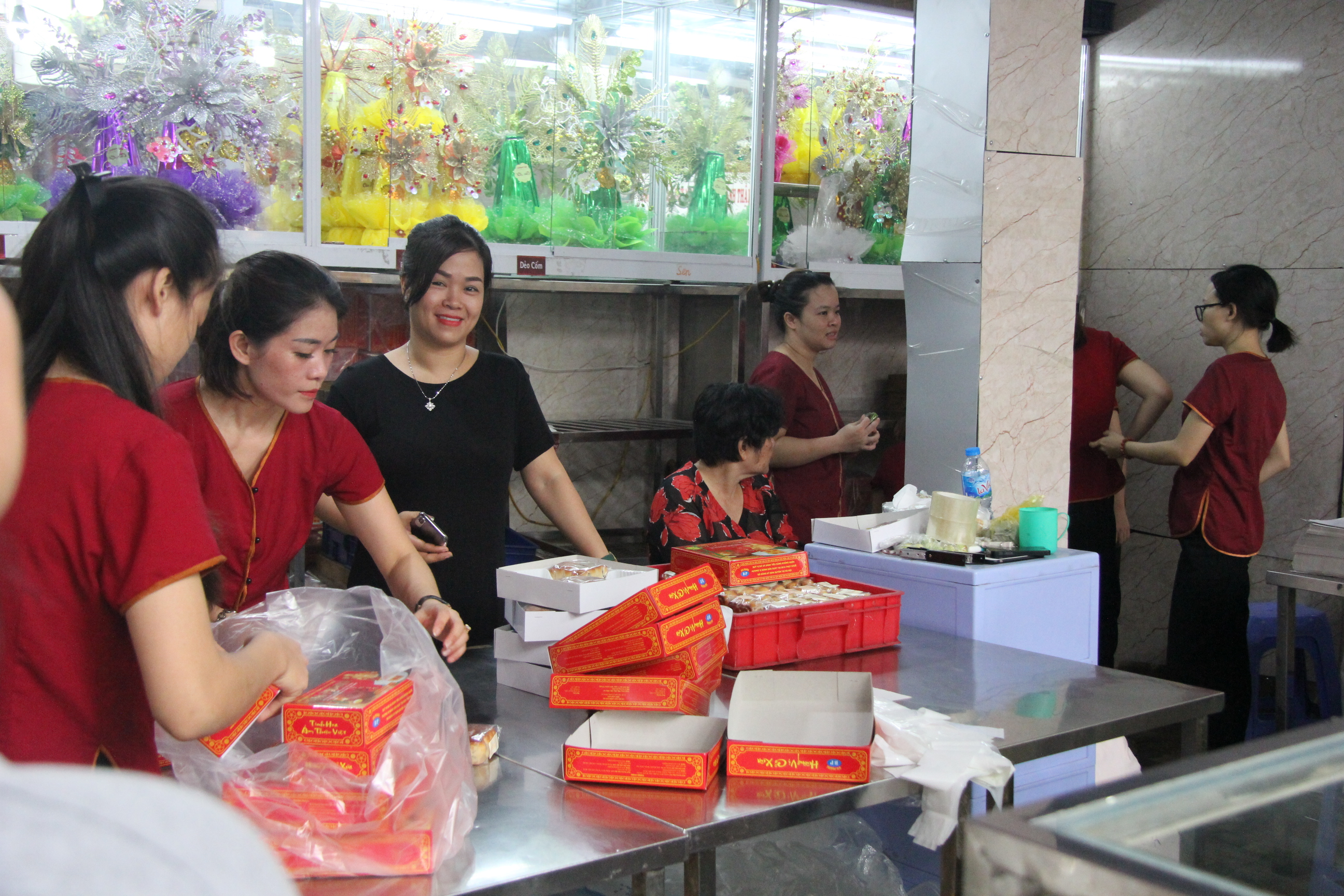 Chị Thu Thủy (áo đen, chủ cửa hàng) vừa gói hàng cho khách vừa chia sẻ, gia đình chuyên sản xuất bánh thập cẩm cổ truyền hợp khẩu vị khách quen. Mỗi năm lượt khách lại tăng thêm nhưng giá bánh vẫn giữ nguyên 50.000 đồng/chiếc trong 5 năm qua. “Mặc dù giá nguyên vật liệu mỗi năm đều tăng nhưng cửa hàng quyết không tăng giá để phục vụ nhu cầu người dân. Tôi và cả trăm nhân viên phải làm việc cật lực từ khâu sản xuất cho tới bán hàng cả ngày lẫn đêm”, chị Thu Thuỷ chia sẻ.