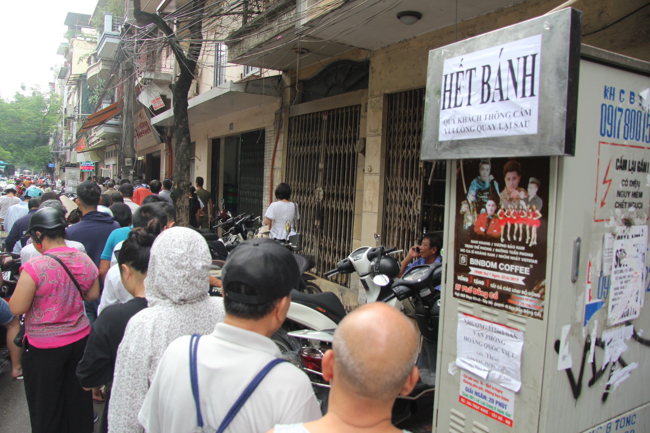 Cảnh dòng người xếp hàng cạnh tấm biển “hết bánh”.