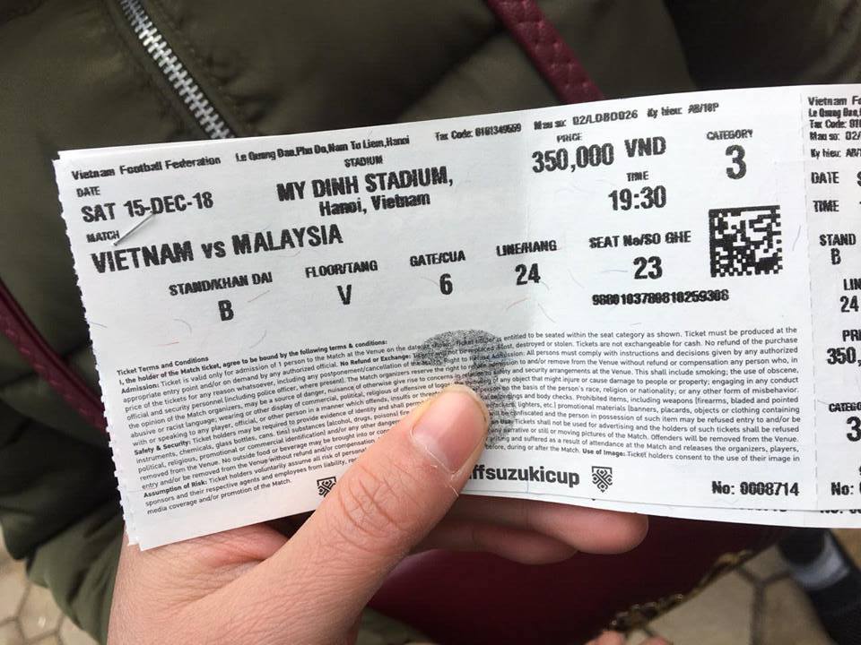 Trên mạng online nhiều nơi cũng rao bán vé trận chung kết với giá rất cao. Theo đó có người vé khán đài C,D giá 6-8 triệu đồng/cặp. Khán đài A,B giá cũng cao ngất ngưỡng lên đến 9-10 triệu đồng/cặp trong khi giá gốc chỉ 500 nghìn đồng.
