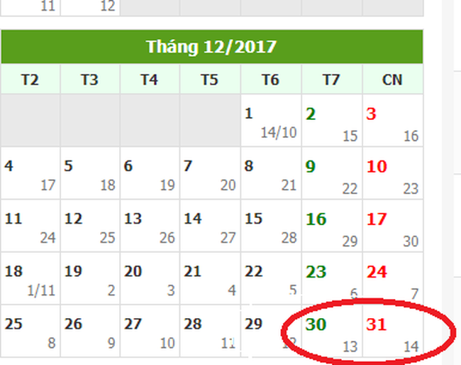 Ngày 30/12 và 31/12 rơi vào 2 ngày thứ 7 và Chủ nhật.