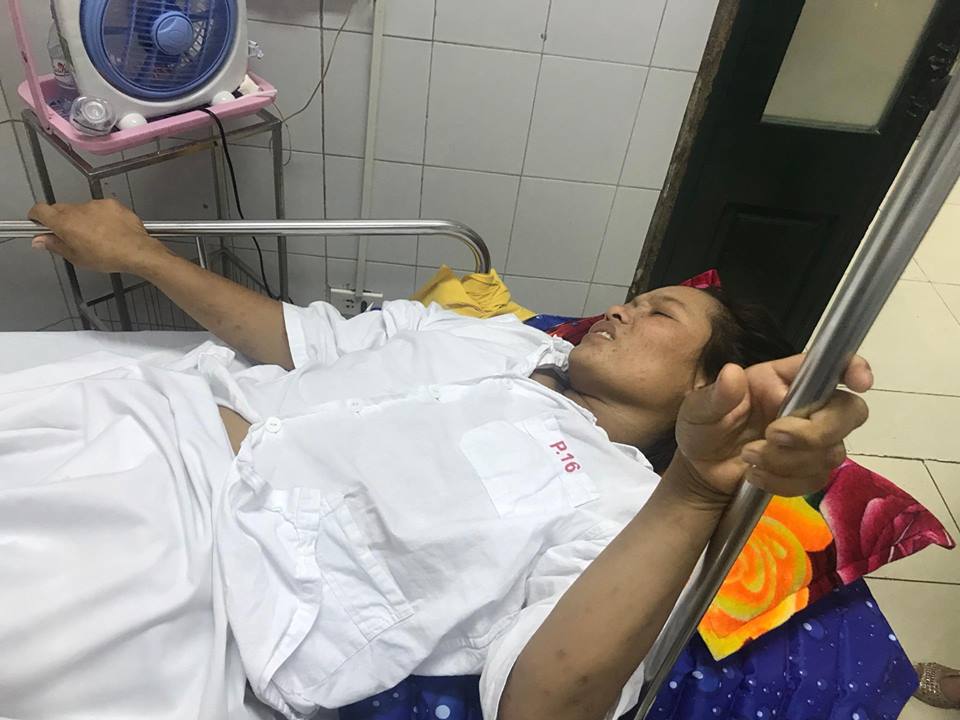 Chiều 13/8, chị Phạm Hồng Thơm (31 tuổi, trú tại thôn Cao Bình, xã Hồng Tiến, huyện Kiến Xương, tỉnh Thái Bình) vẫn đang nằm điều trị tại Khoa chấn thương chỉnh hình, Bệnh viện Việt Đức. Chị Thơm liên tục lấy tay bám chặt vào thanh sắt chắn giường bệnh.