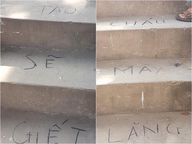 Dòng chữ hung thủ để lại trên cầu thang trong ngôi nhà xảy ra vụ việc.