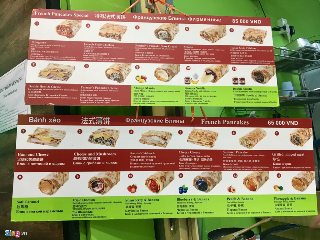 Ngoài chữ bánh xèo, cả thực đơn này không có chữ tiếng Việt nào. Khi được hỏi về nguyên liệu của các loại bánh, khách hàng được yêu cầu “nhìn hình và đoán”. Ảnh: Ngân Giang.