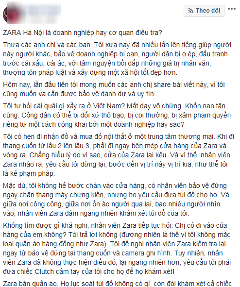 Khi tôi đi qua cửa từ thì cửa từ kêu. Nhân viên Zara yêu cầu tôi đứng ở đây, rồi yêu cầu tôi nhích sang đây 1 tí, nhích tiếp 1 tí nữa, tôi đều thực hiện theo. Khi bạn ấy đòi kiểm tra đồ đạc của tôi, tôi có bảo bạn ấy nếu không tin hãy hỏi bảo vệ hoặc check camera để biết chính xác tôi có bước chân vào cửa hàng hay không nhưng bạn ấy nhất quyết cho rằng, vì cửa từ kêu nên bạn ấy có quyền lục soát túi xách của tôi”.