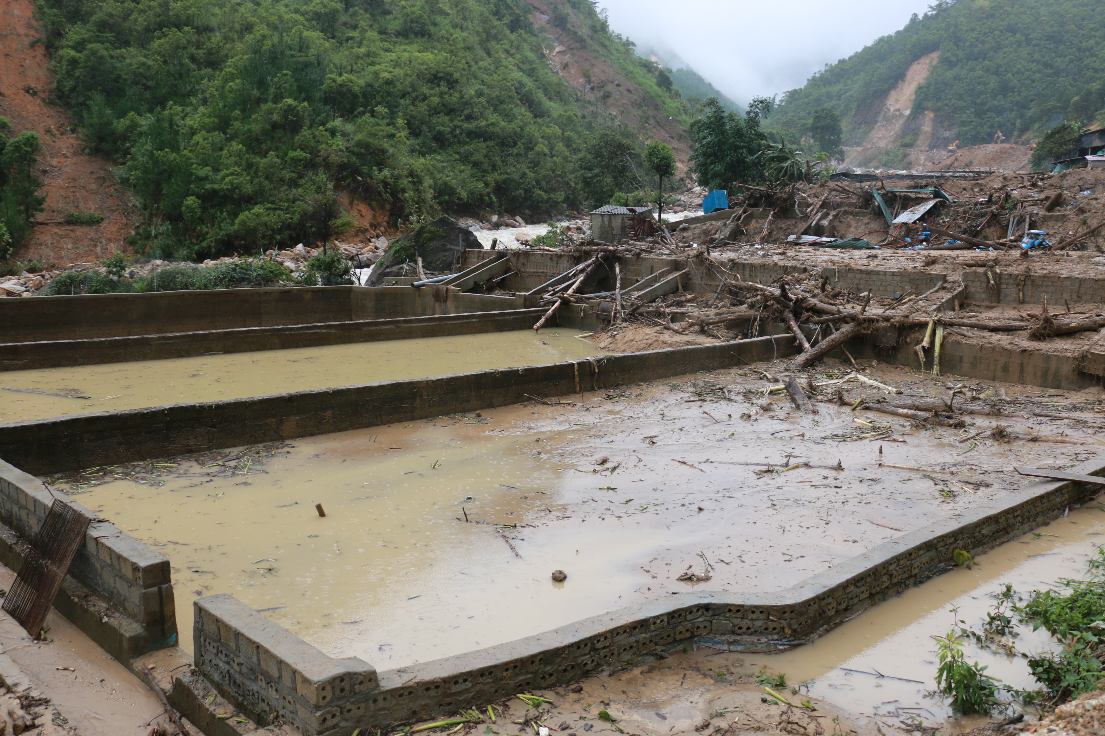 Nhiều ao nuôi cá tầm của người dân cũng bị nước lũ cuốn trôi.