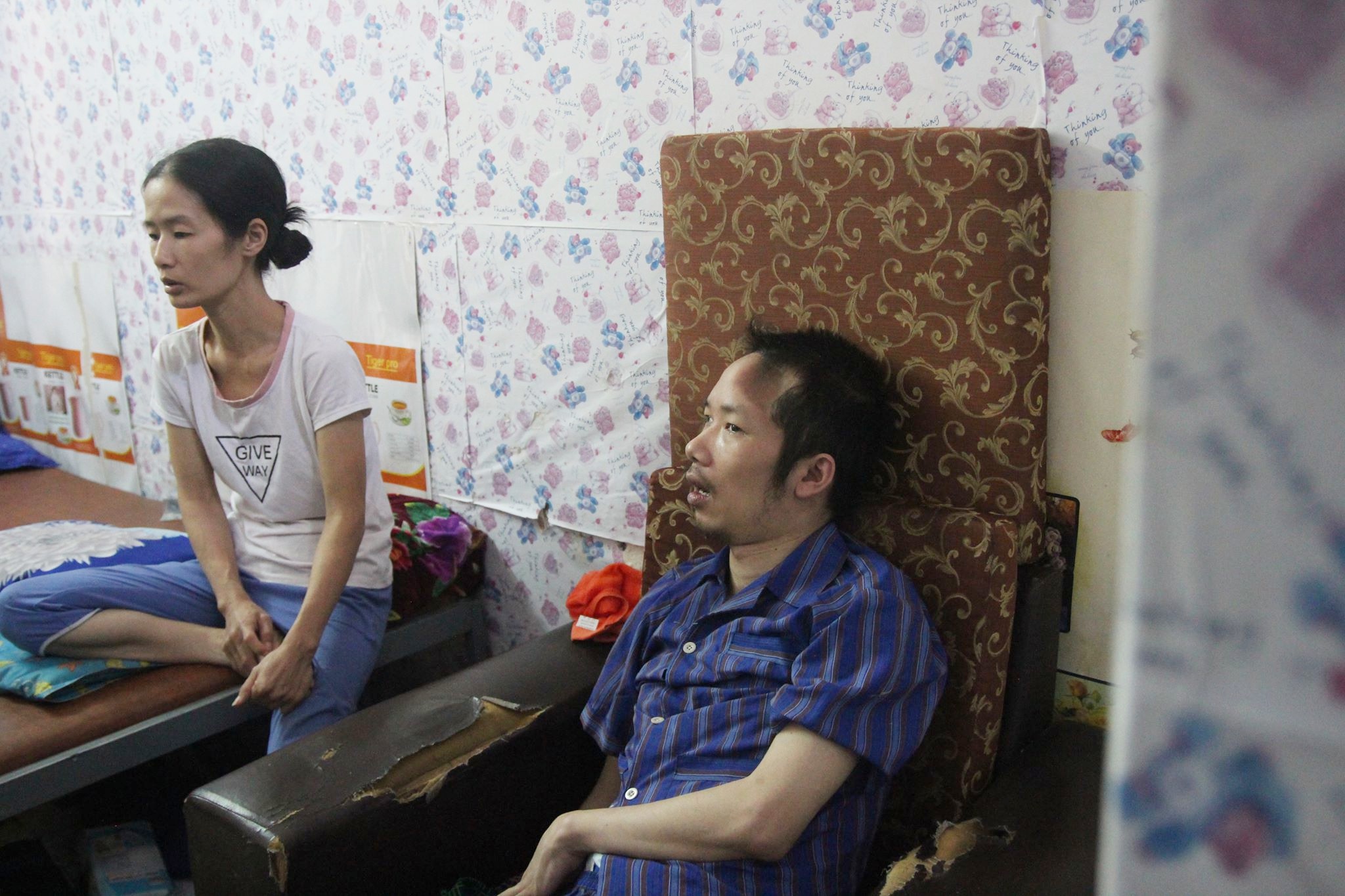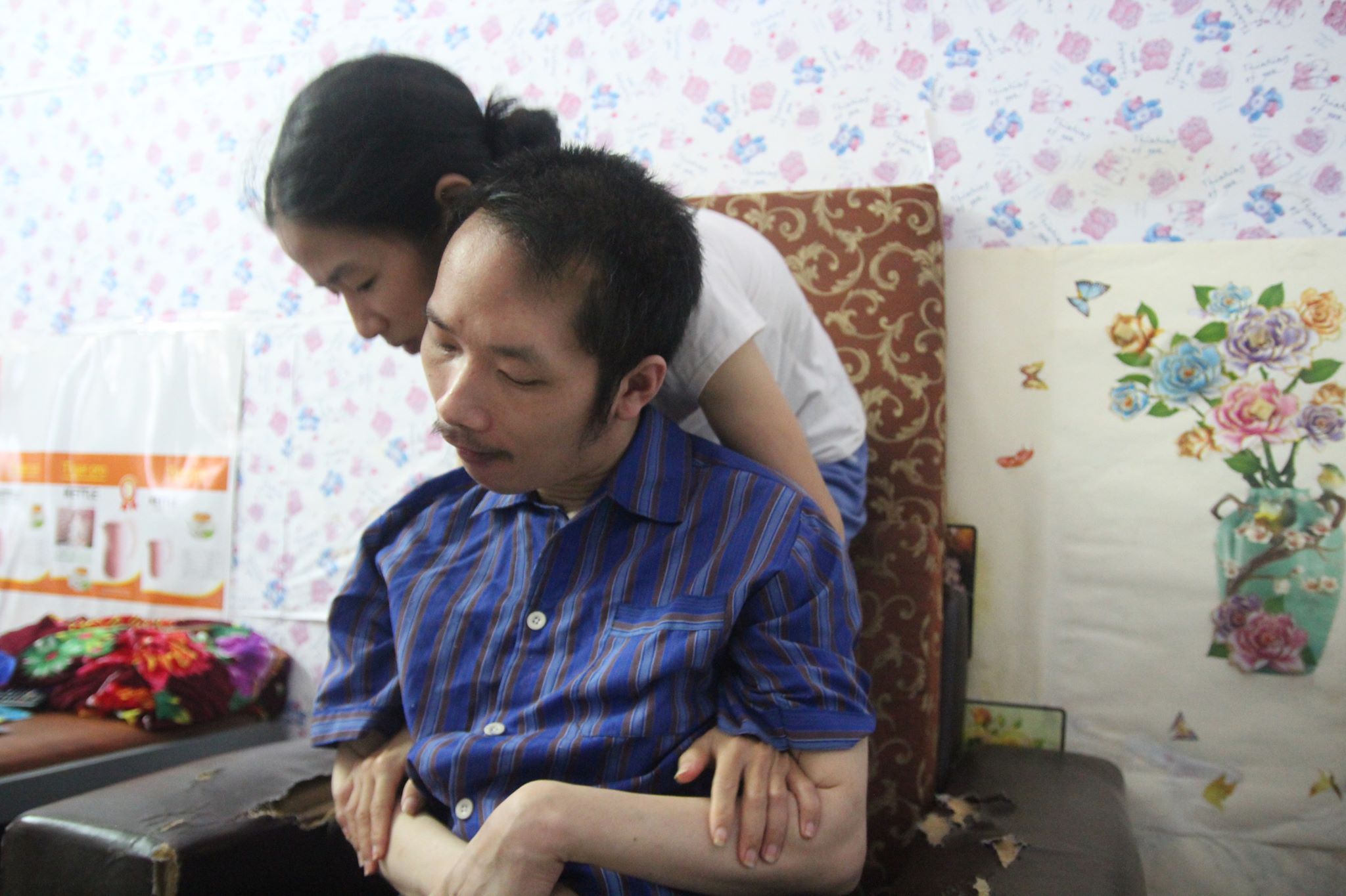 Tình cờ quen được một người phụ nữ làm trong Hội Chữ Thập Đỏ, đồng cảm với câu chuyện của vợ chồng, người này đón anh chị về ở cùng và chỉ lấy tiền phòng 500.000 đồng mỗi tháng. Chị bảo, hôm trước mới cân ở nơi làm việc biết được chỉ nặng 32 kg cả quần áo. Dù nhỏ người nhưng mọi cử chỉ của người vợ đều nhanh thoăn thoắt, chị dễ dàng nhấc người chồng nặng gần 50 kg lên để vệ sinh và cho ăn uống.