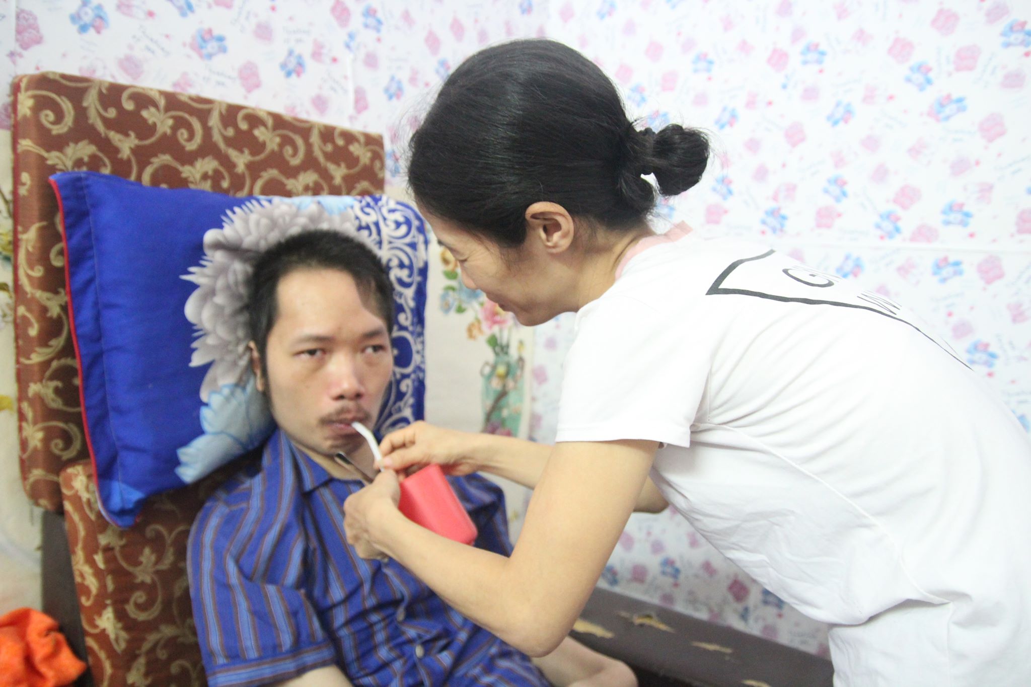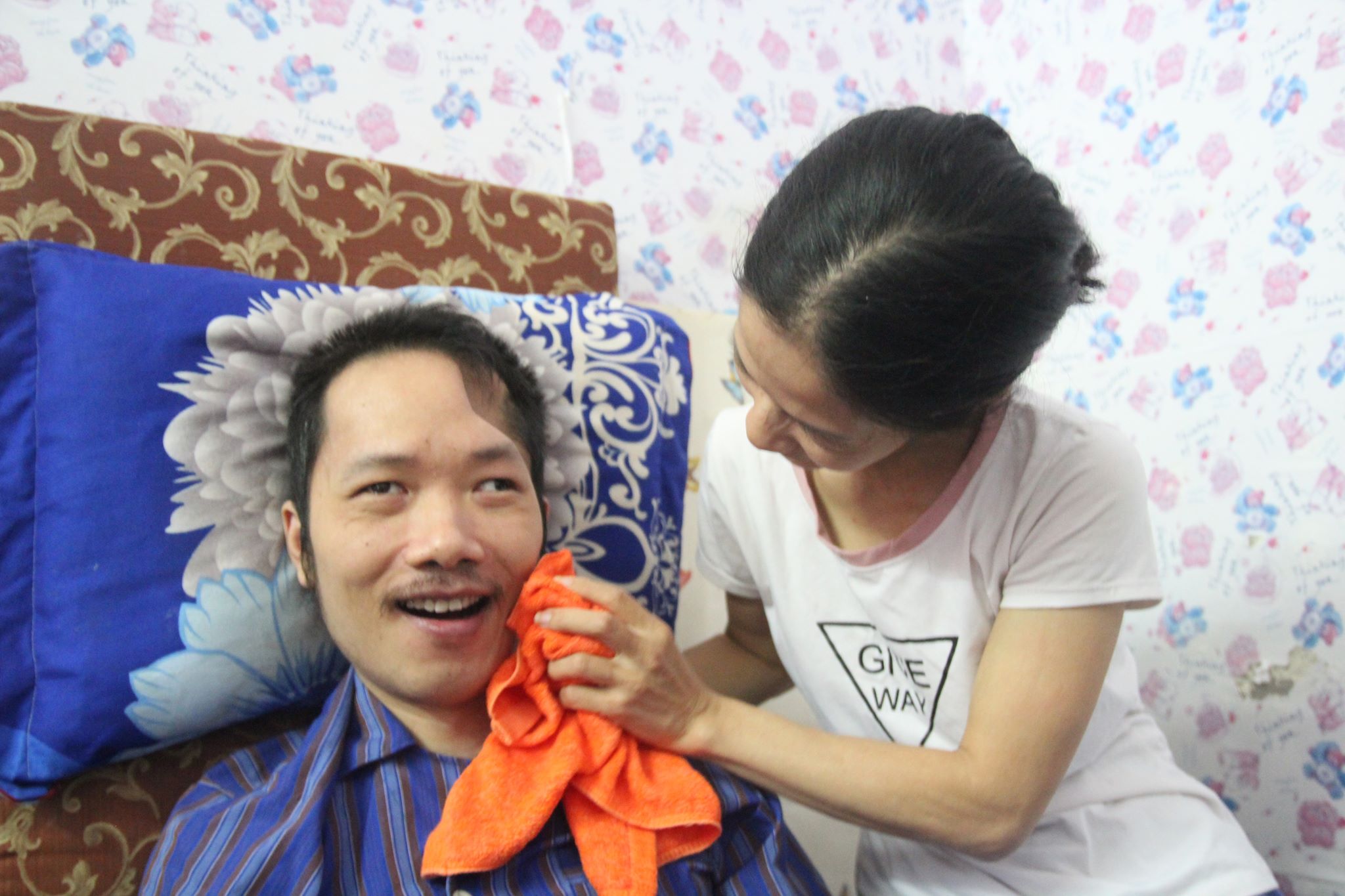Cũng có khi chồng ốm, chị Trang phải ở nhà chăm sóc nên chẳng có thu nhập gì, những lúc đó chị phải đi xin cơm từ thiện ở viện để hai vợ chồng sống qua ngày. Dù anh Trung bị ốm, nhưng nhờ bàn tay người vợ chăm sóc, nước da anh vẫn hồng hào và cơ thể vẫn sạch sẽ.