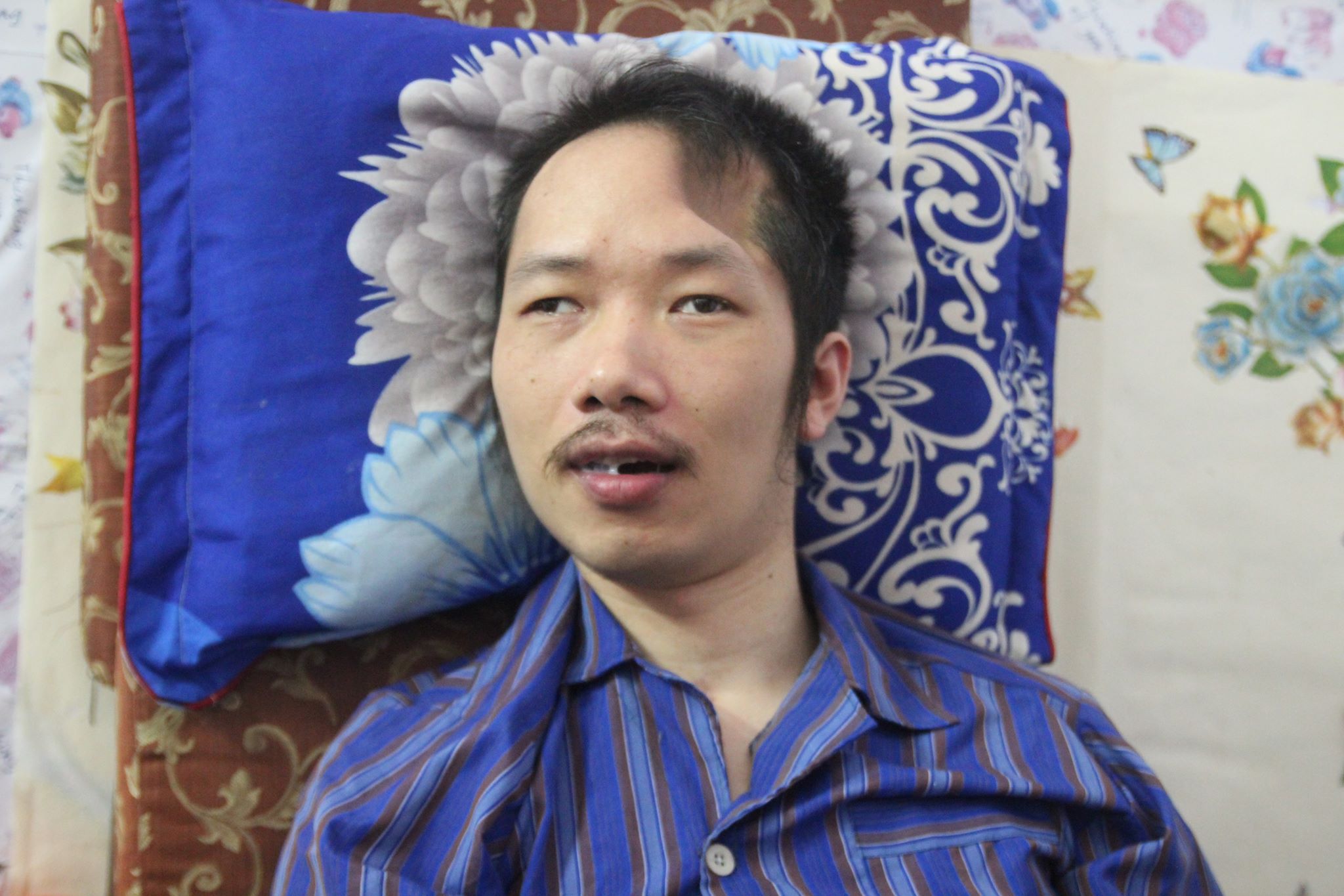 Do nằm quá lâu chân tay anh Trung co quắp, người thẳng như khúc tre, đầu bị lõm sâu nhưng may mắn vẫn nhận thức được mọi thứ. 10 năm nằm một chỗ khiến tính tình của anh trở nên cáu bẳn, khó chiều. Mỗi khi muốn cắt tóc, gội đầu, cạo râu hay thậm chí là cho ăn uống, chị Trang phải dùng hết “mỹ từ” và những lời ngon ngọt để nịnh chồng.