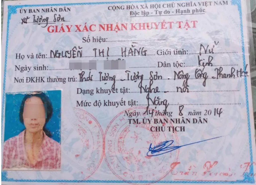 Giấy chứng nhận khuyết tật của chị Hằng. Ảnh: báo Người lao động.