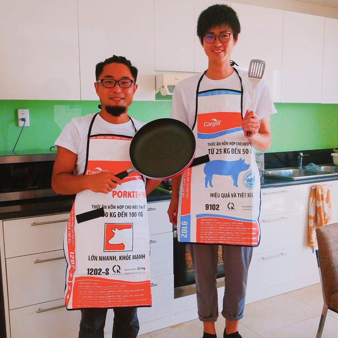 Tạp dề làm từ vỏ bao cám heo vô cùng độc đáo.