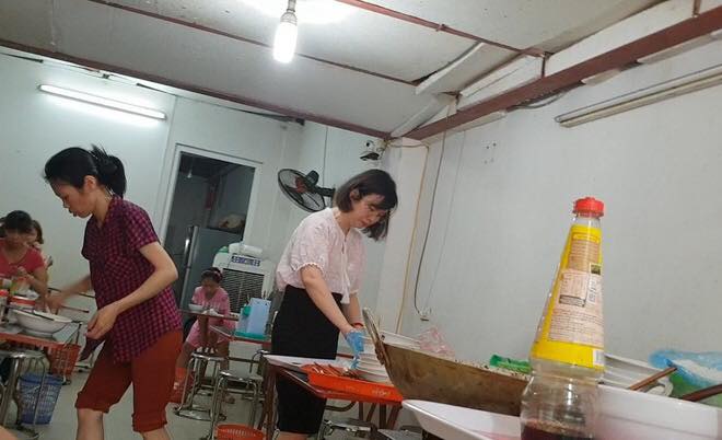 Vào sáng nay, khi người phụ nữ mặc váy mua, bê phở đi thì một lúc sau người này quay lại với một nữ tình nguyện viên cầm bát, đũa trả lại cho chủ quán.