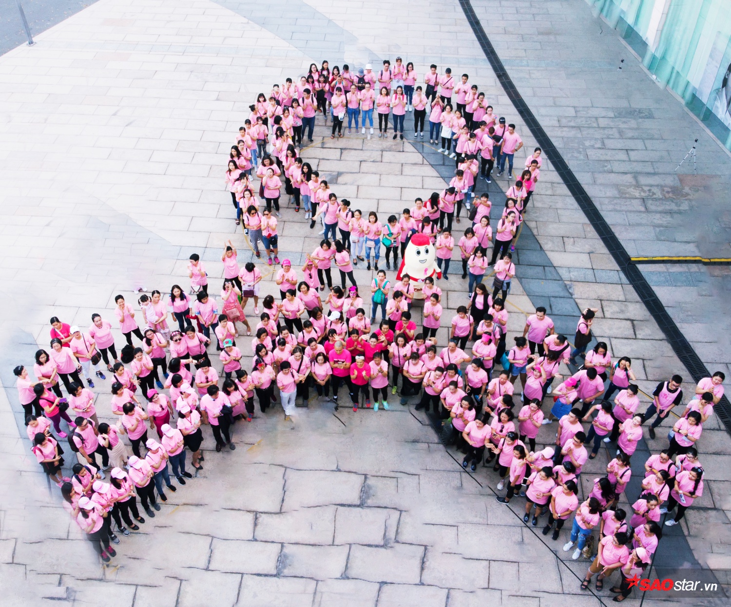 Hơn 600 bệnh nhân và tình nguyện viên xếp thành chiếc nơ hồng khổng lồ.