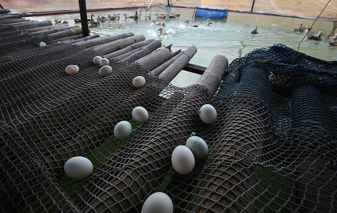 Mỗi ngày đàn vịt đẻ hàng trăm trứng, quả trứng dài to là con đực, thon nhỏ là con cái và sẽ được đưa vào ấp riêng.