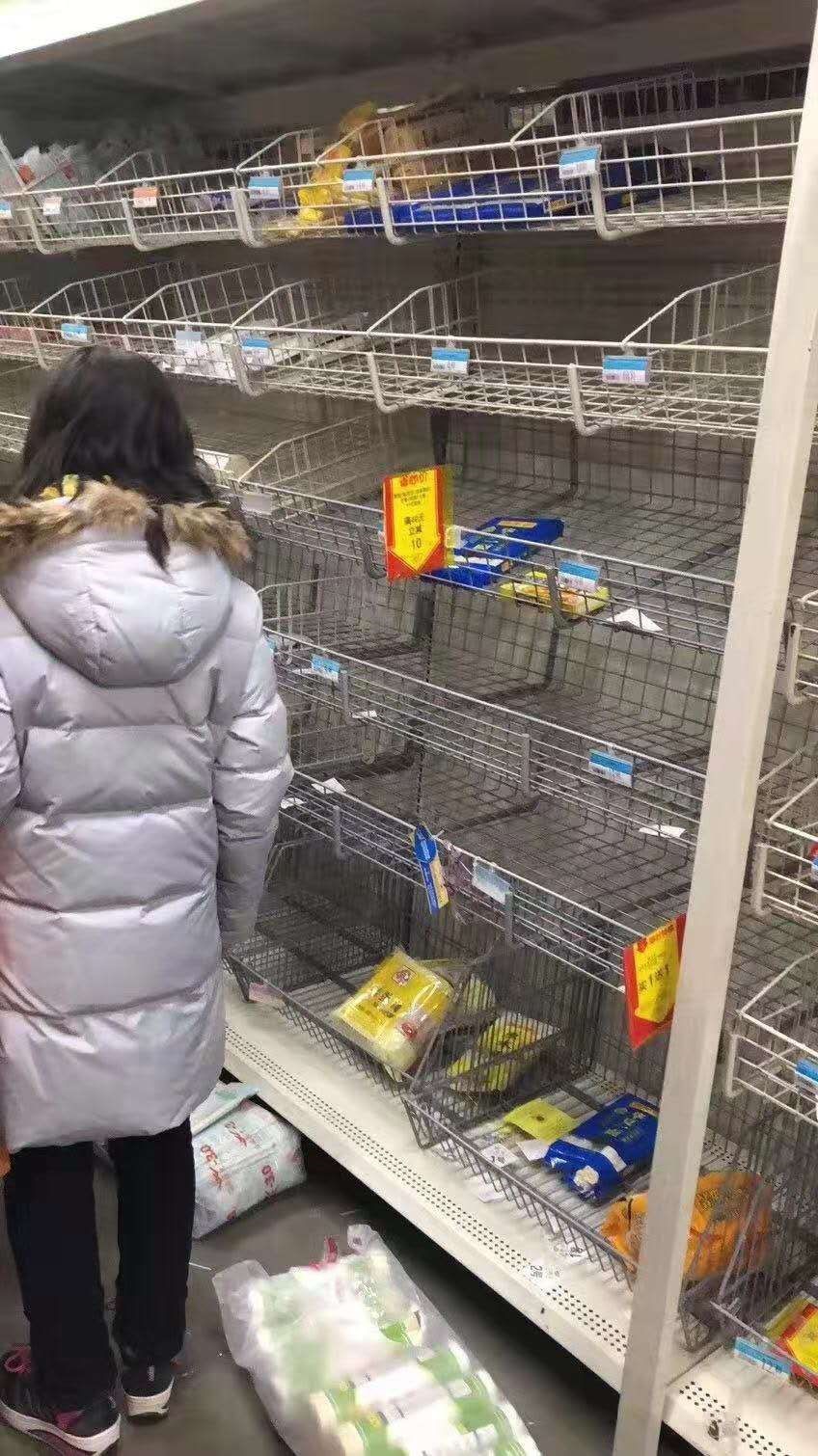 Các kệ hàng trống trơn tại một siêu thị ở Vũ Hán. Ảnh: Đỗ Quang Duy.