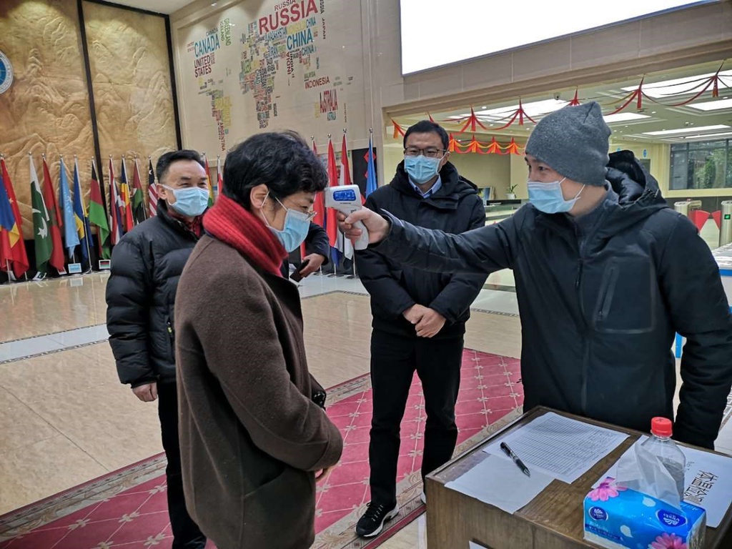 Kiểm tra thân nhiệt tại ký túc xá. Sinh viên và nhân viên trường đều đeo khẩu trang. Ảnh: Đỗ Quang Duy.