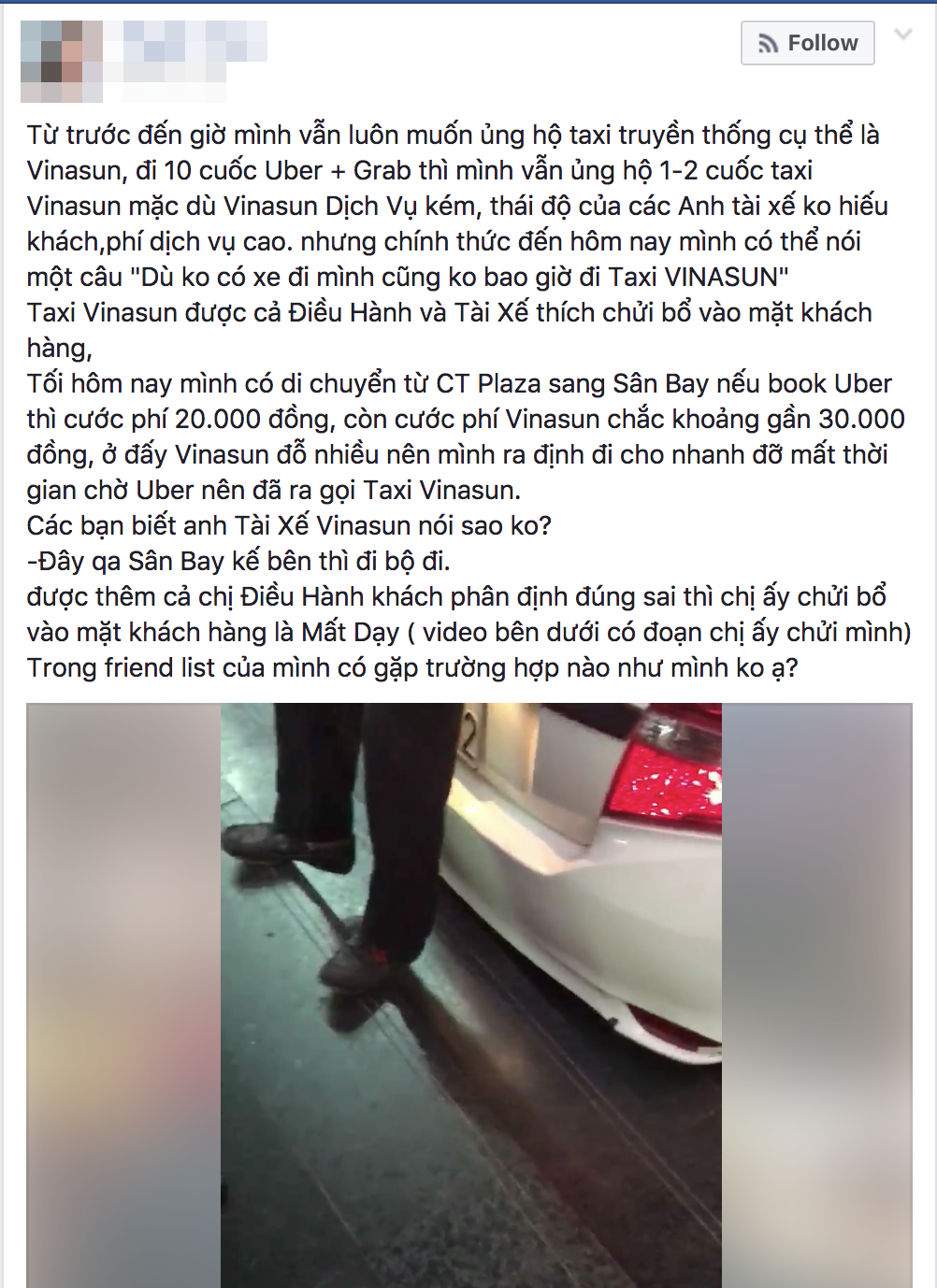 Chưa đầy một ngày sau khi đăng tải đoạn clip cho rằng tài xế và người điều hành taxi Vinasun tại trung tâm thương mại CT Plaza đã có thái độ khiếm nhã với khách hàng khi người này gọi xe đi từ đây đến sân bay, trang cá nhân của T.T, một người mẫu có tiếng ở TP HCM đã có hơn 500 ngàn lượt xem và hàng ngàn lượt bình luận, trong đó đa phần lên án thái độ của cô gái này, nhưng cũng không ít người lên tiếng bênh vực T.T vì từng trải qua trường hợp tương tự.