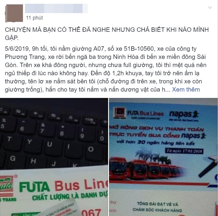 Ngày 6/7, trên mạng xã hội Facebook xuất hiện bài viết của một cô gái tên H.L chia sẻ về việc mình bị nhân viên xe Phương Trang sàm sỡ ngay trên xe trong lúc đang ngủ. Mặc dù, đã bị cô gái phát hiện nhưng nam nhân viên này tiếp tục lặp lại hành vi bồi bại, thậm chí còn định đưa tiền để cô im lặng.