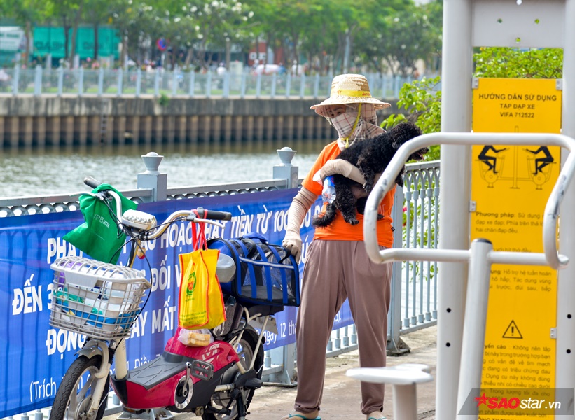 Nhiều người dân đang đưa chó cưng đi dạo trong công viên nhưng không đeo rọ mõm cũng bị lực lượng chức năng nhắc nhở