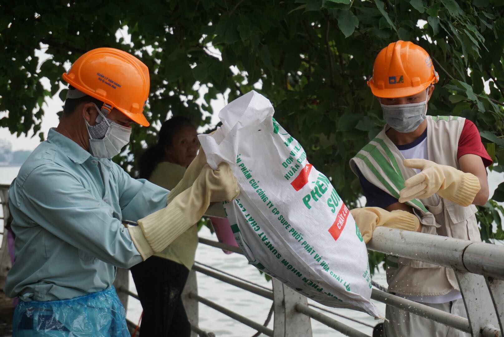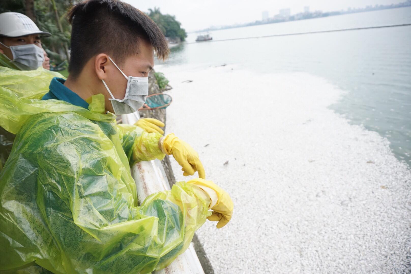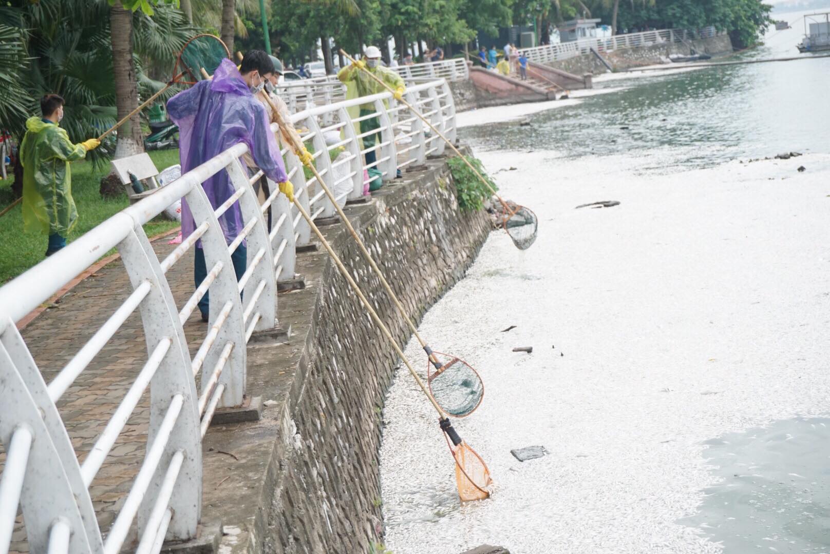 Nhiều công nhân môi trường tích cực vớt cá chết tại hồ Tây.
