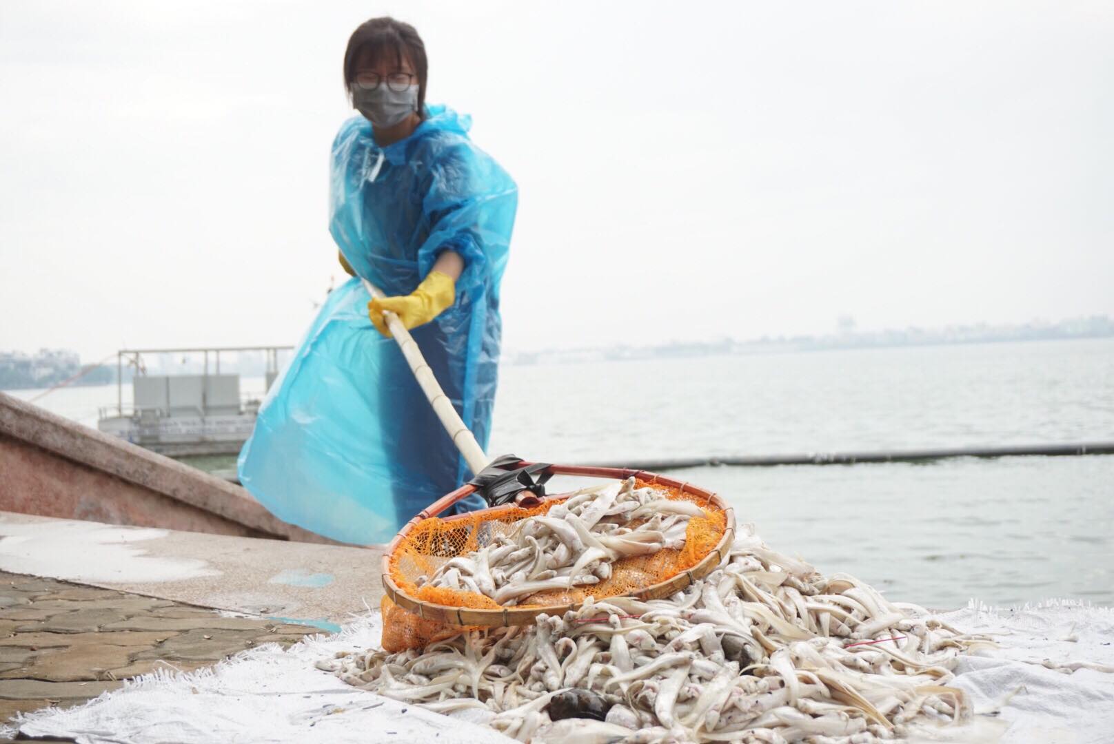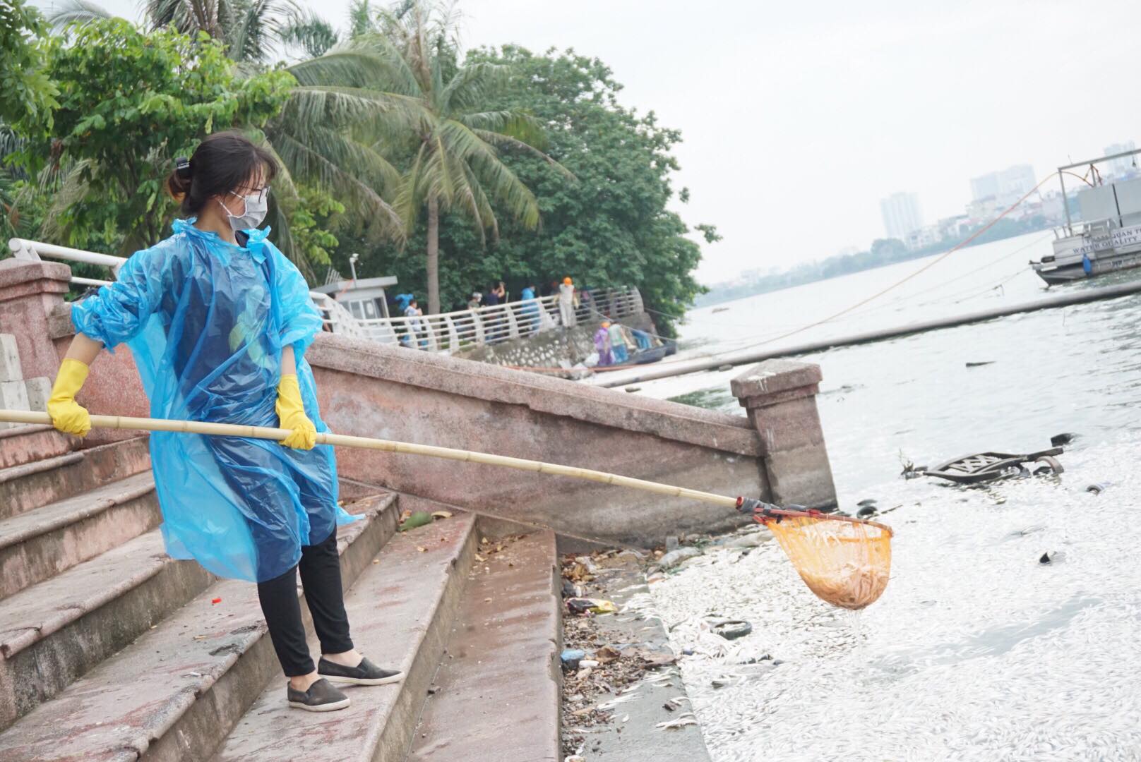 Nhiều nữ thanh niên tình nguyện của quận Tây Hồ vớt mỏi tay nhưng số lượng cá không thấy vơi mà mỗi lúc nổi lên càng nhiều.