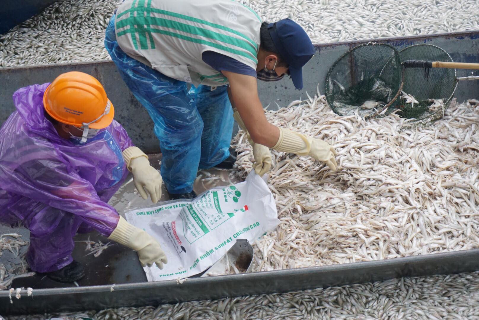 Công nhân gồng mình vớt cá chết sau khi xúc lên thuyền.