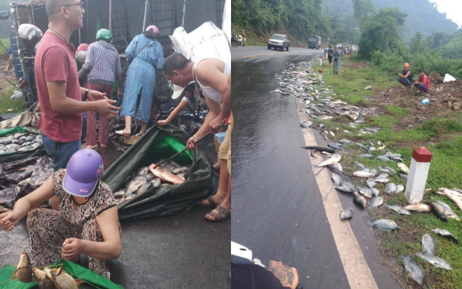 Tối 13/9, ông Bùi Thanh Liêm, Trưởng Công an xã Quy Hậu, huyện Tân Lạc, tỉnh Hoà Bình cho biết, chiều cùng ngày có một chiếc xe tải chở cá khi di chuyển trên dốc Quy Hậu thuộc địa bàn xã đã gặp nạn khiến cá rơi vãi khắp đường.