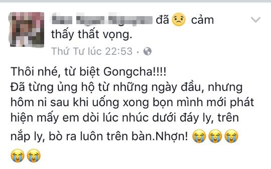 “Đã nghe tin rất nhiều lần nhưng tôii không tin và đến ủng hộ. Nhưng đi uống thì thực sự tôi thất vọng lắm. Nhìn nó bò mà thấy nỗi da gà . Bỏ một số tiền lớn để sử dụng sản phẩm mà mọi người thấy thế này được không. Ảnh hưởng đến sức khoẻ. GONG CHA CẠN LỜI. Share cho mọi người để biết nếu ko muốn ảnh hưởng đến sức khỏe.” - nội dung bài chia sẻ.