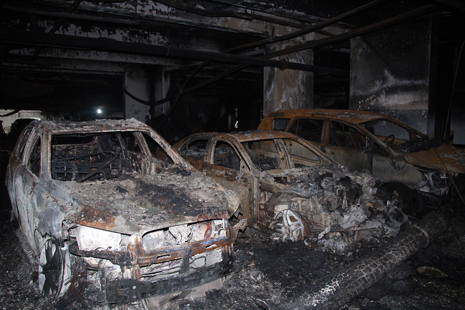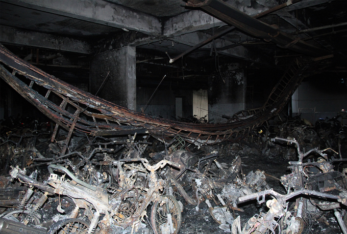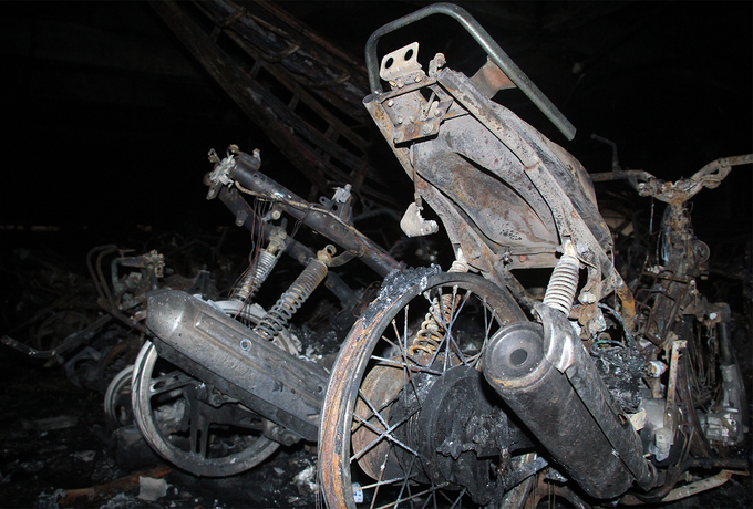 Bãi xe máy gần lối ra của block B bị cháy rụi hoàn toàn. Khu vực này ước tính có hơn 150 chiếc trơ khung, nằm ngổn ngang.